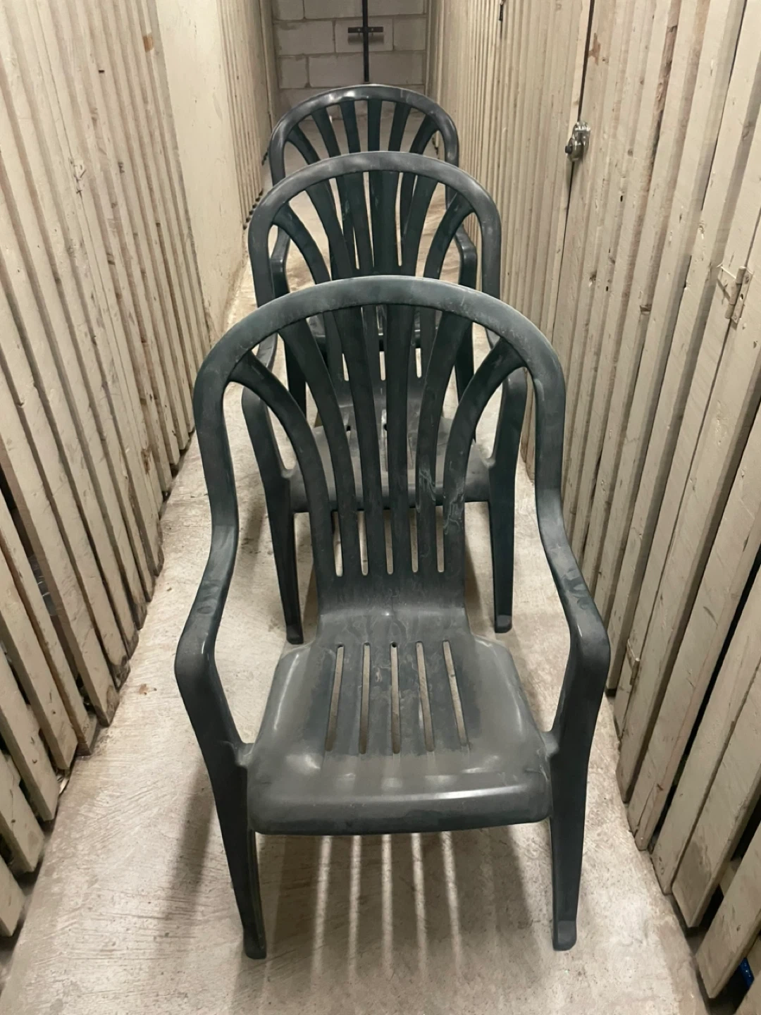 3 dark grey plastic patio chairs. They're made of durable plastic. These chairs are stackable and suitable for outdoor use.