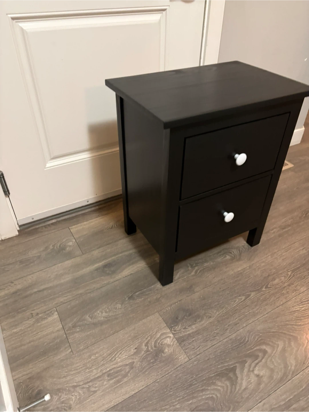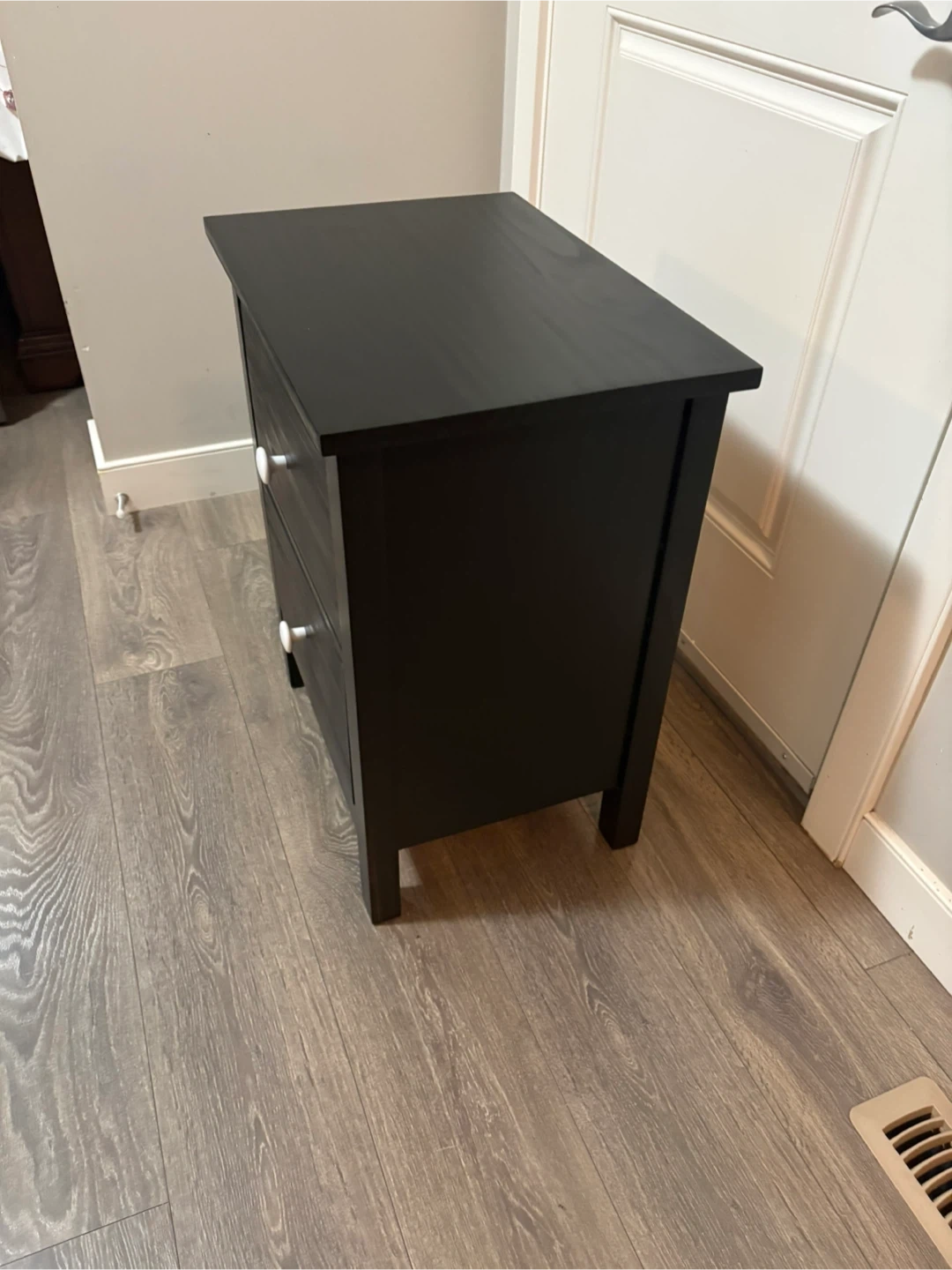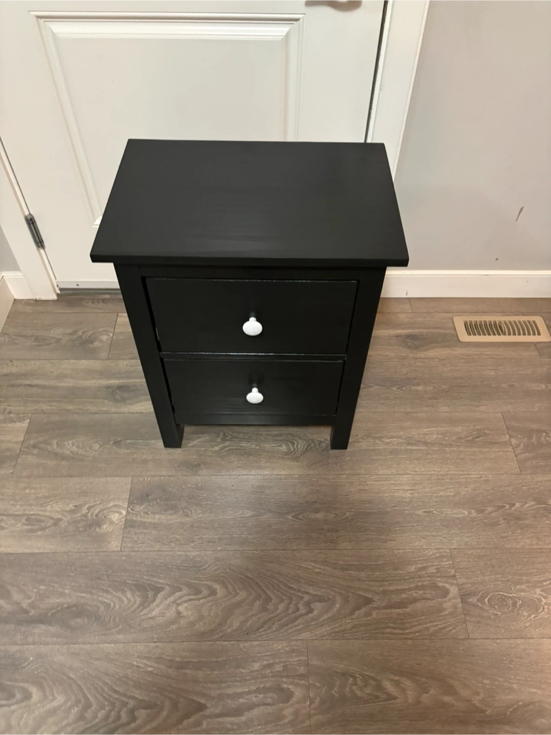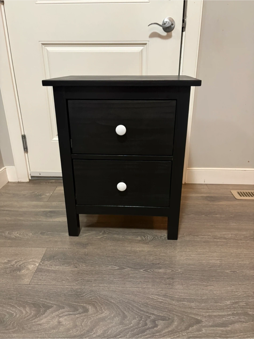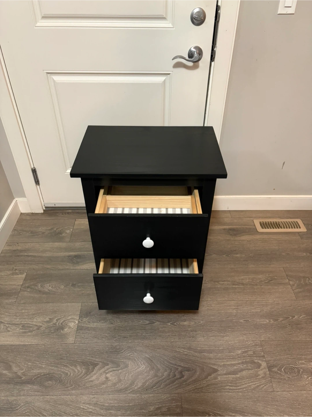 This is a stylish refinished black nightstand with two drawers, perfect for adding storage and a touch of elegance to any bedroom space. It is in excellent condition. The drawers are on rolls and slide smooth.