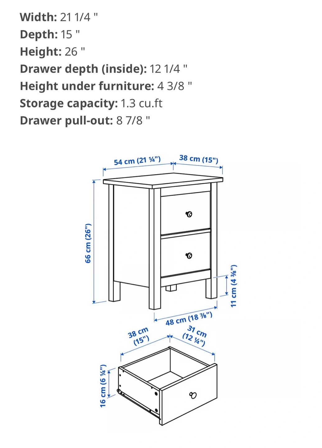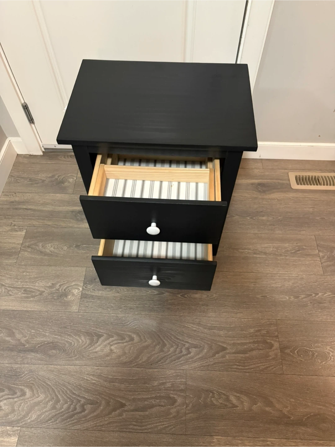 This is a stylish refinished black nightstand with two drawers, perfect for adding storage and a touch of elegance to any bedroom space. It is in excellent condition. The drawers are on rolls and slide smooth.
