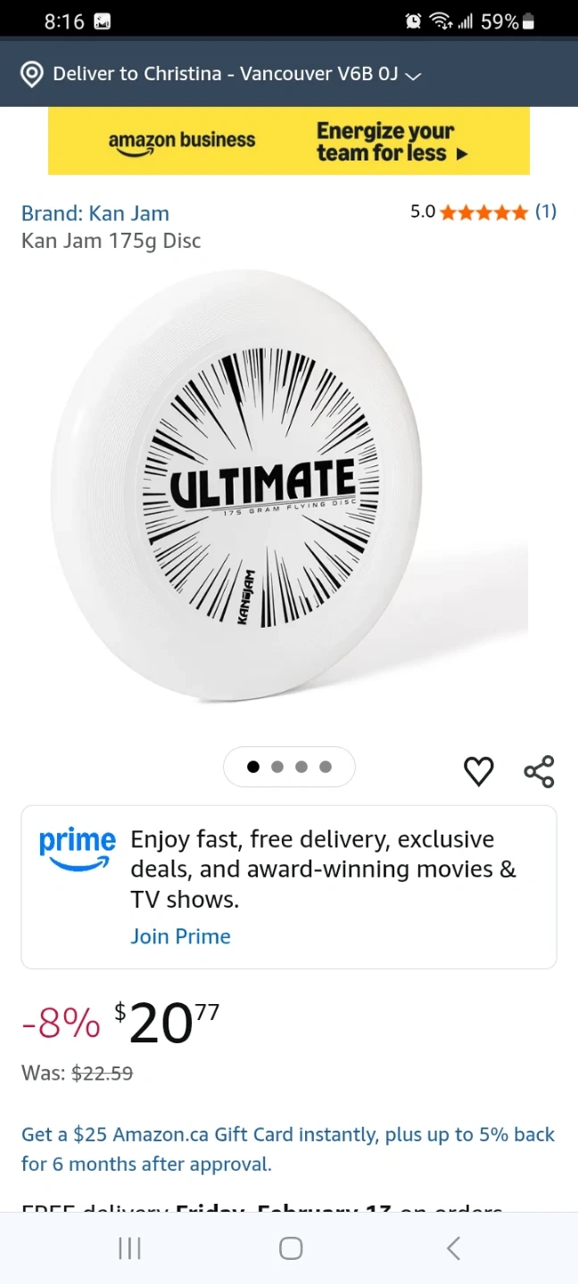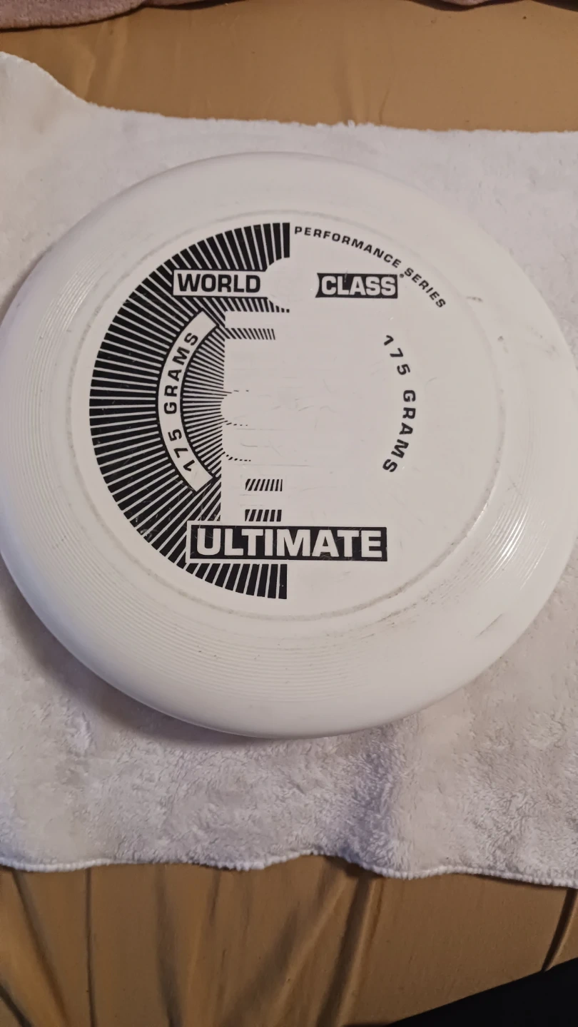 This is a white Kan Jam Ultimate disc. It weighs 175 grams. It's great for playing catch or ultimate frisbee! Second photo shows what it looked like new, but use has worn the gold decals off! It was great fun winning and loosing battles with this disc but I've retired now and my equipment can be used by new players!