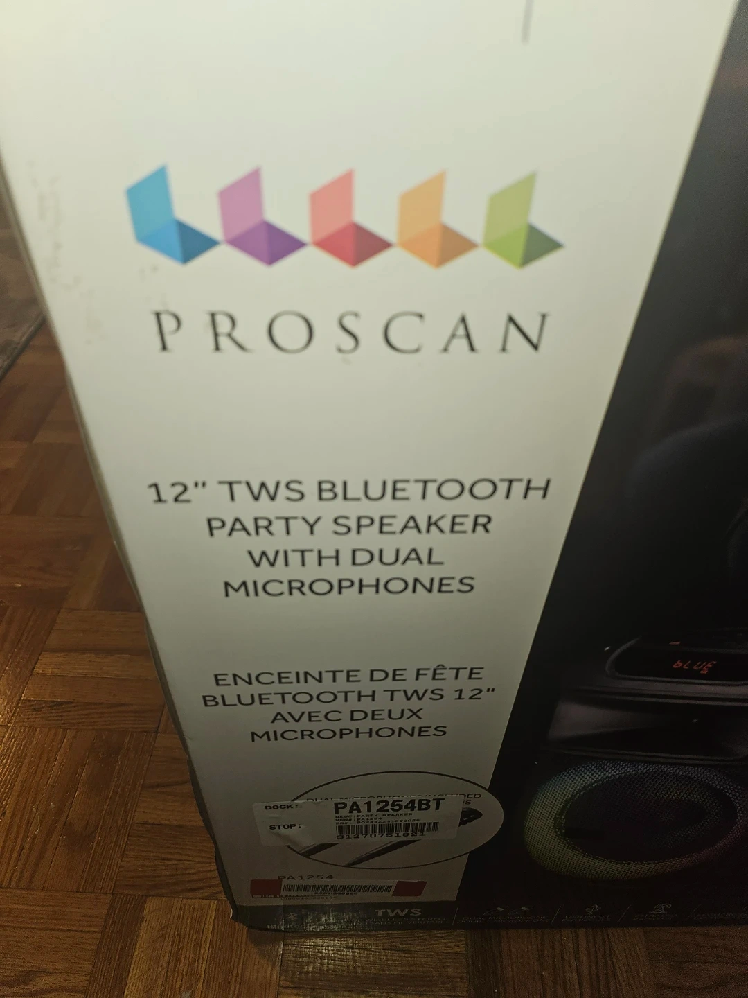 This PROSCAN party speaker is 12 inches and features TWS Bluetooth connectivity. It comes with dual microphones. Its colourful light display adds to the ambiance for any get-together!
