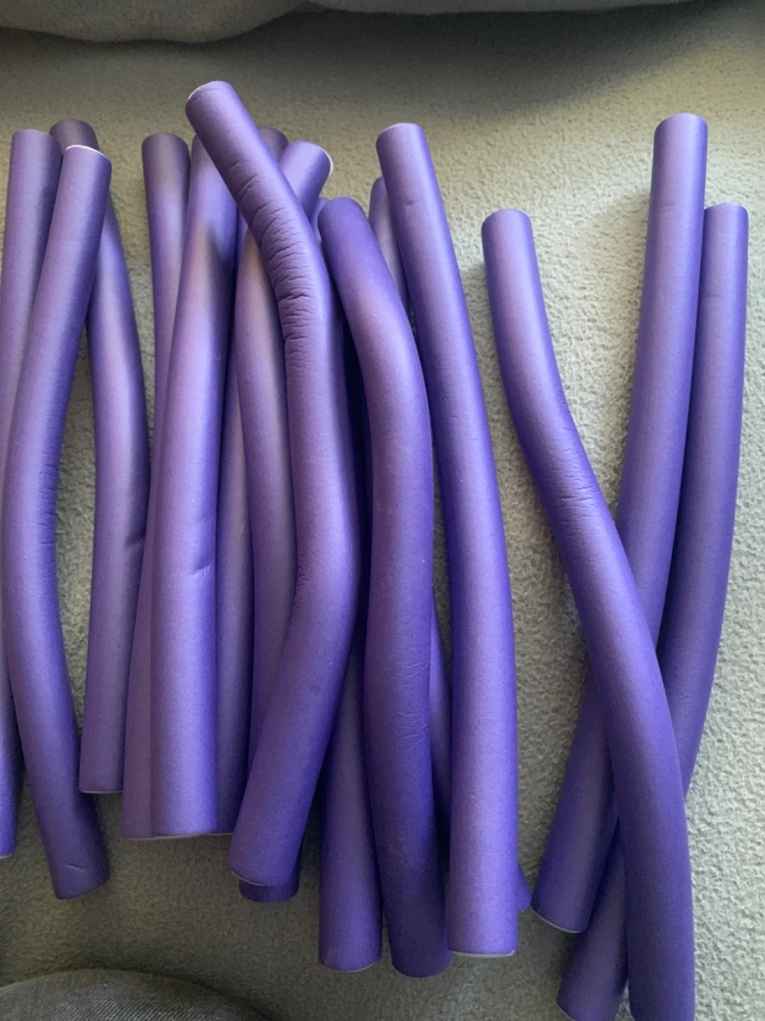 These are purple foam hair rollers. They're flexible and easy to use for curling hair. Material is foam. 15 rollers.