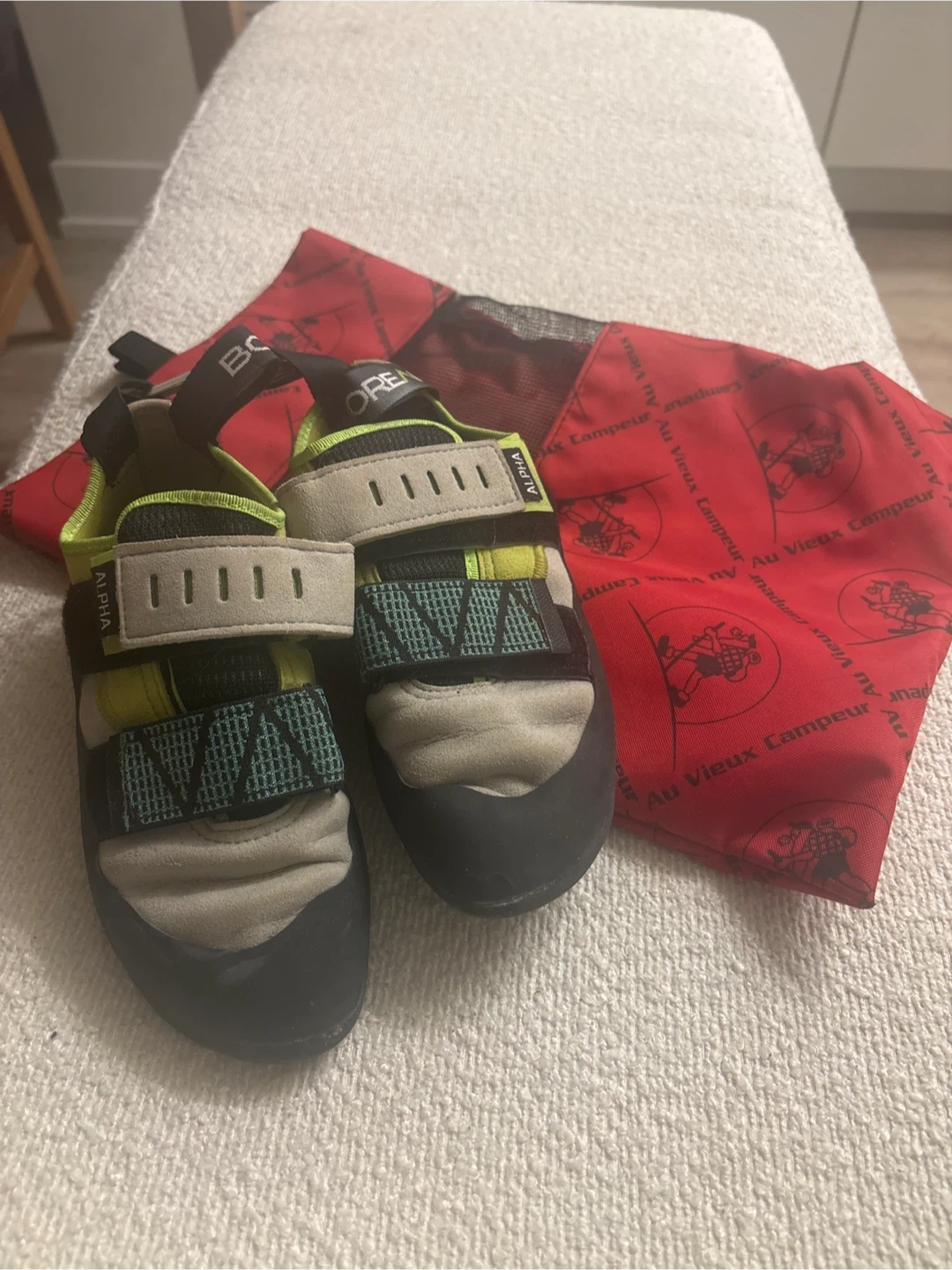 Boreal Alpha climbing shoes in size EU 37 and US 5 Includes a red bag. Good conditions - I just don’t go climbing regularly anymore. You can of course try them on before deciding.