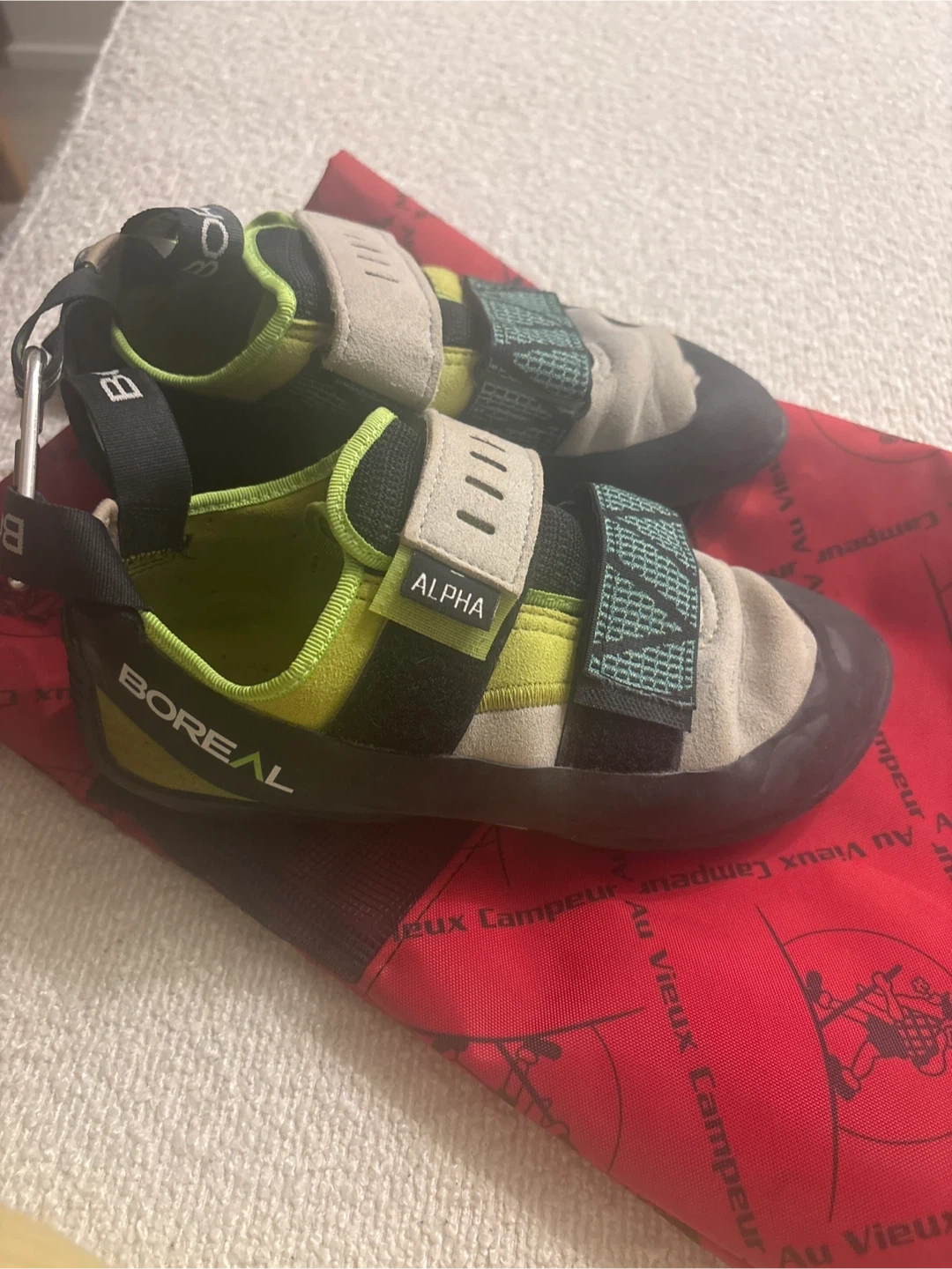 Boreal Alpha climbing shoes in size EU 37 and US 5 Includes a red bag. Good conditions - I just don’t go climbing regularly anymore. You can of course try them on before deciding.