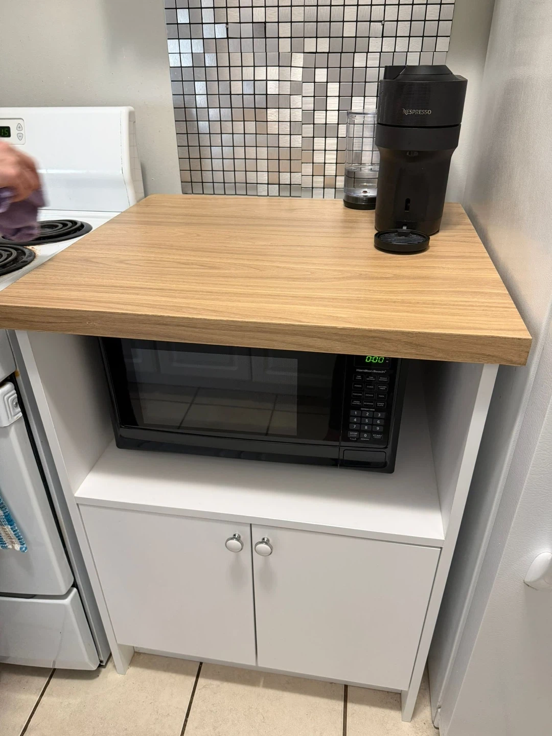 This kitchen stand features a microwave shelf and a two-door cabinet below for storage. It has a durable wood-look countertop surface. Perfect for organizing your kitchen appliances and essentials!