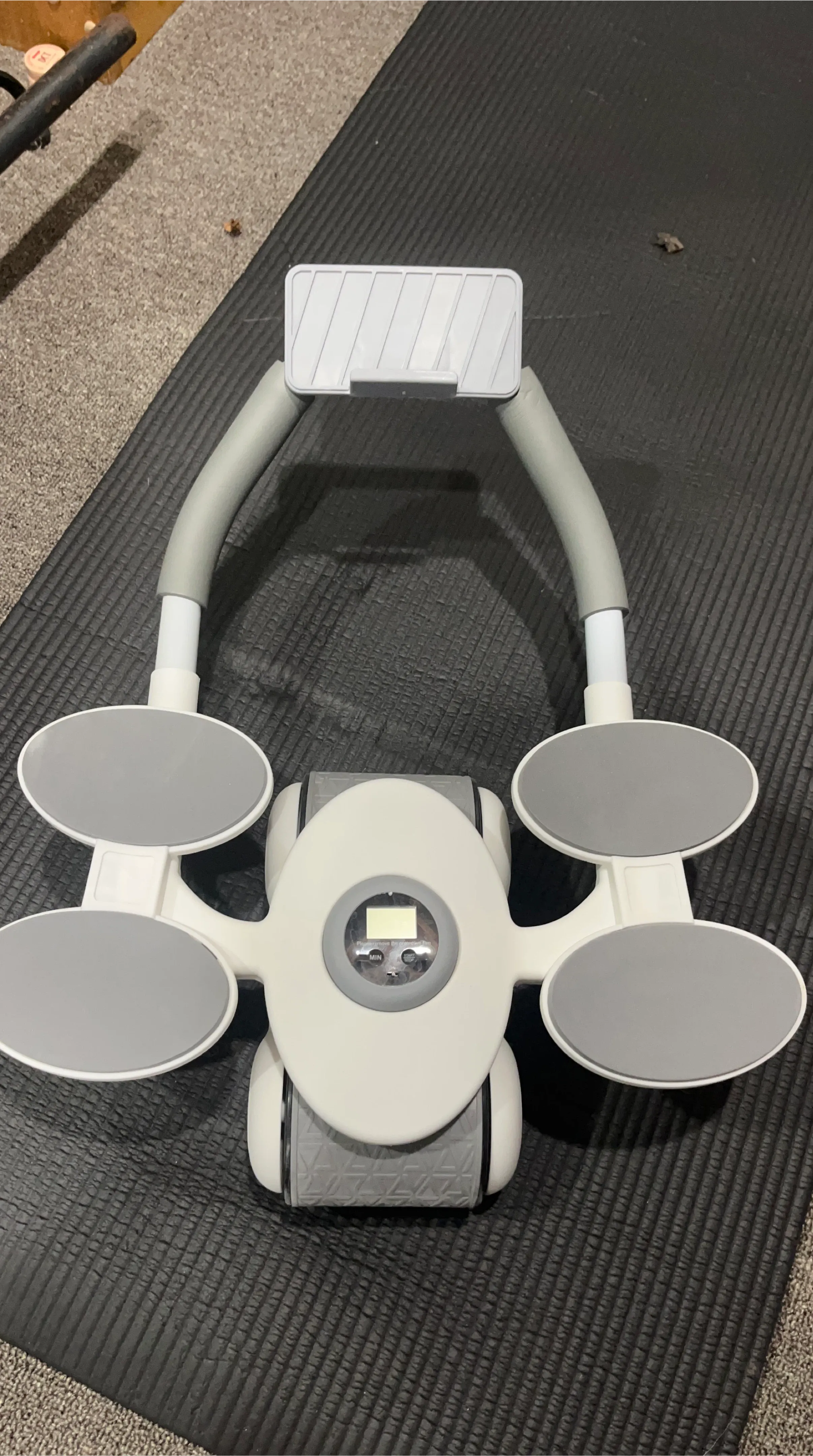 This ab roller wheel helps with core workouts. It features a digital display showing workout time and reps. The padded knee rests provide comfort during use. Great for targeting your abs and improving core strength!