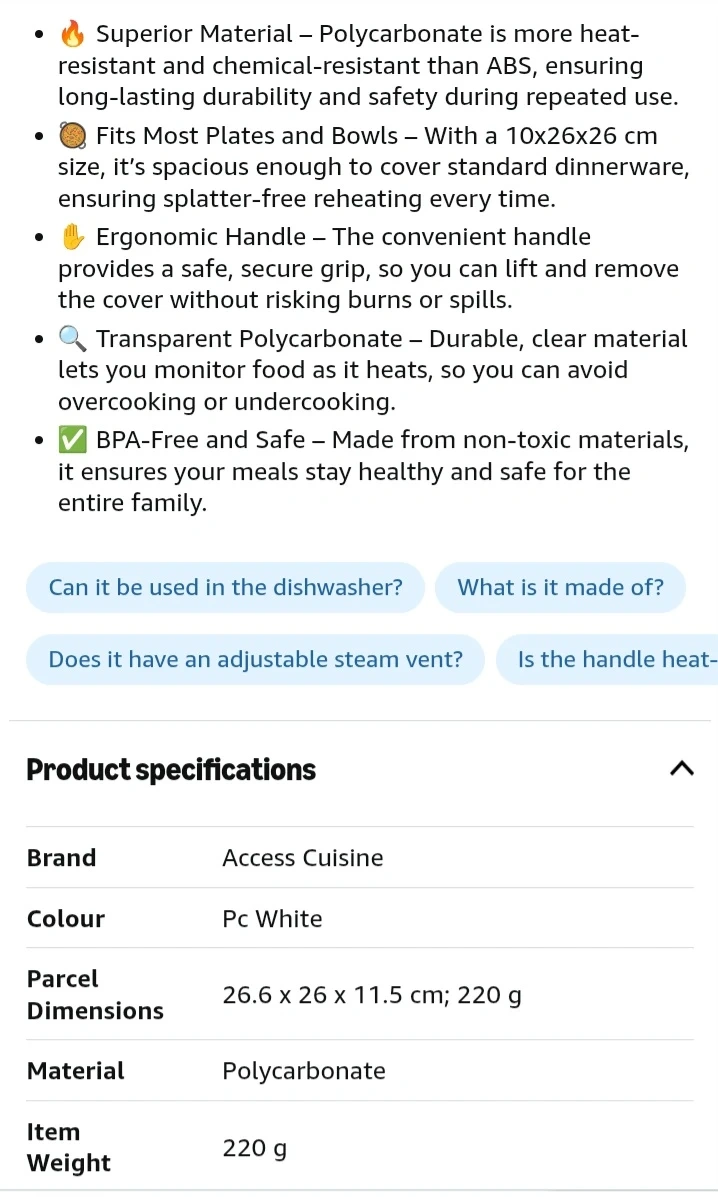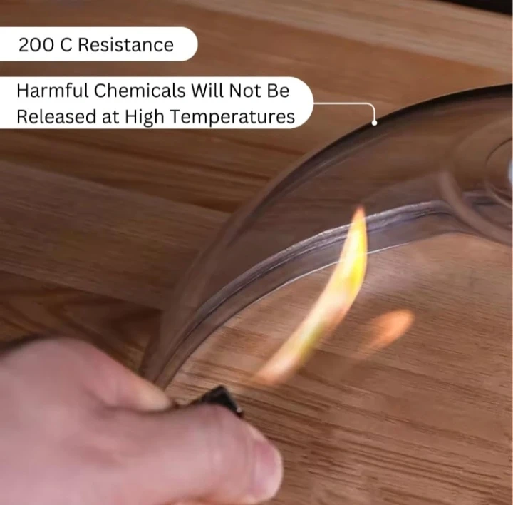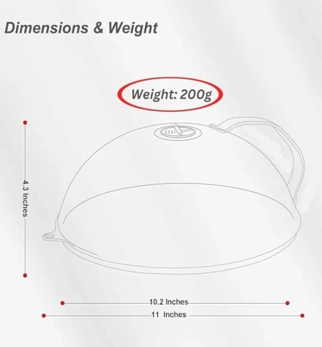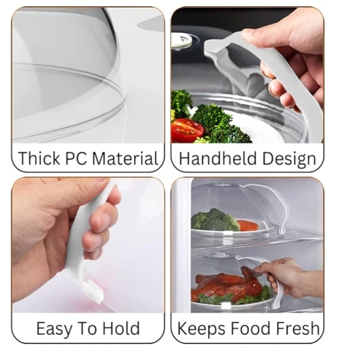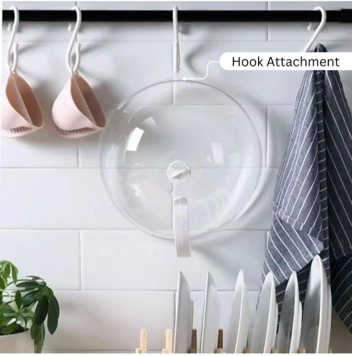 This microwave cover helps prevent splatters and keeps food warm. It's made of thick PC material and resists up to 200°C. It features an adjustable steam vent and a handheld design for easy use. The cover also includes a hook attachment for convenient storage. You can also use this to cover food on the table and helps keep flies and bugs away.