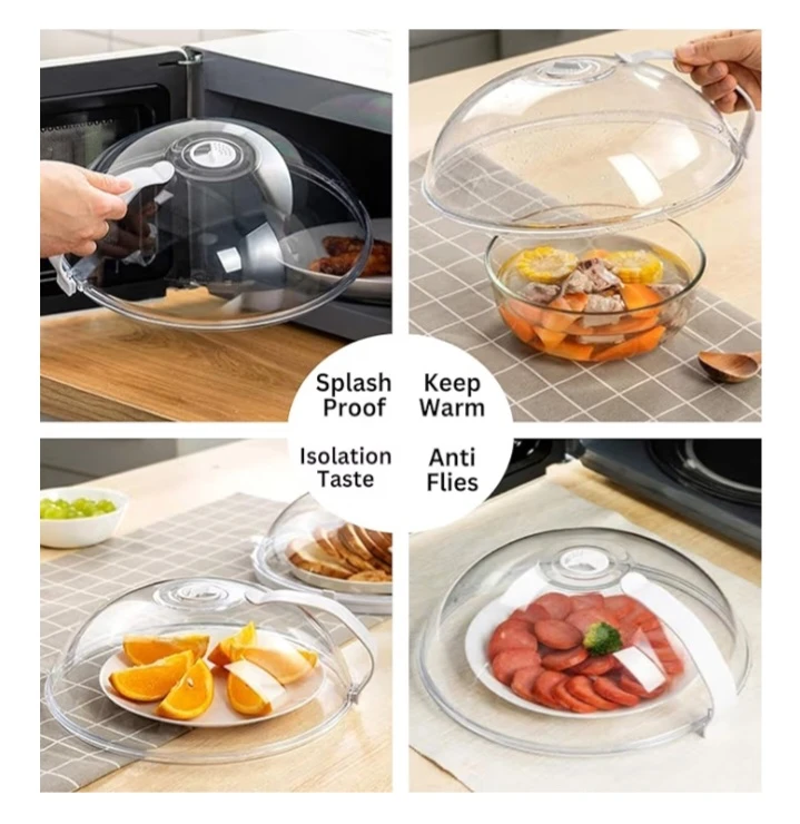 This microwave cover helps prevent splatters and keeps food warm. It's made of thick PC material and resists up to 200°C. It features an adjustable steam vent and a handheld design for easy use. The cover also includes a hook attachment for convenient storage. You can also use this to cover food on the table and helps keep flies and bugs away.