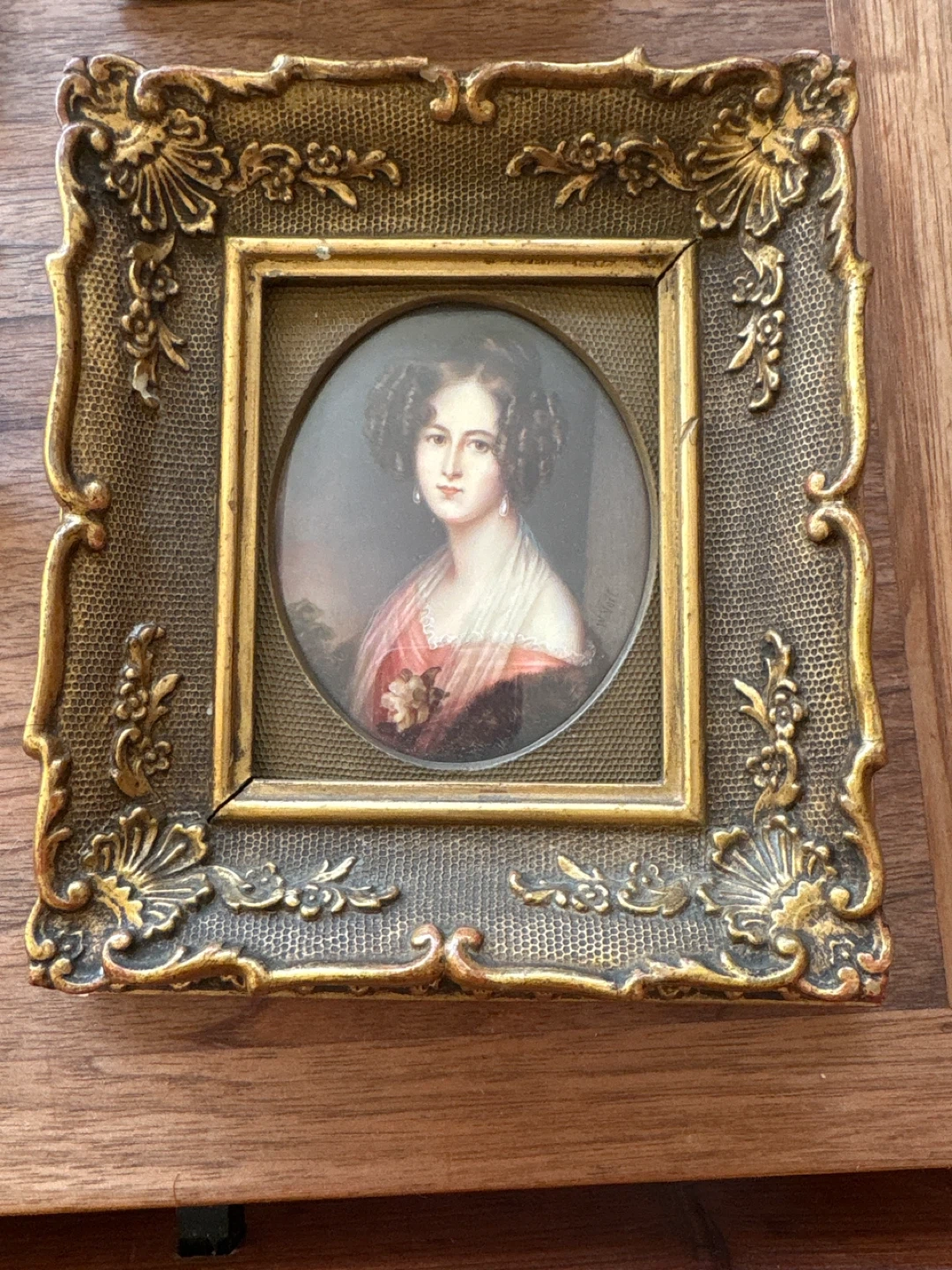 This is a lovely antique miniature portrait painting in a decorative frame. The painting depicts a woman with elaborate hair and period clothing. It's a charming piece for display!