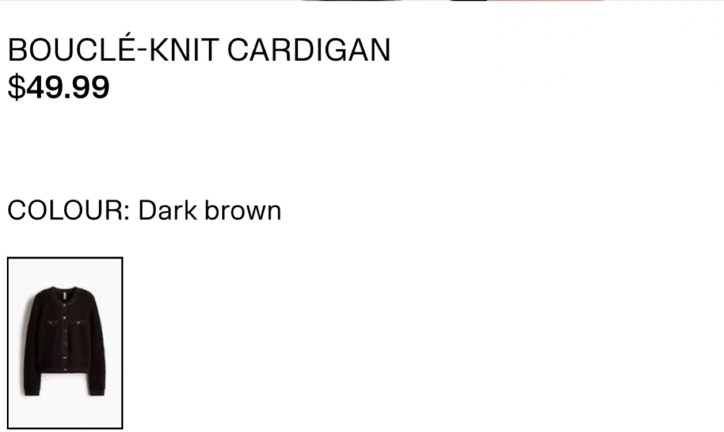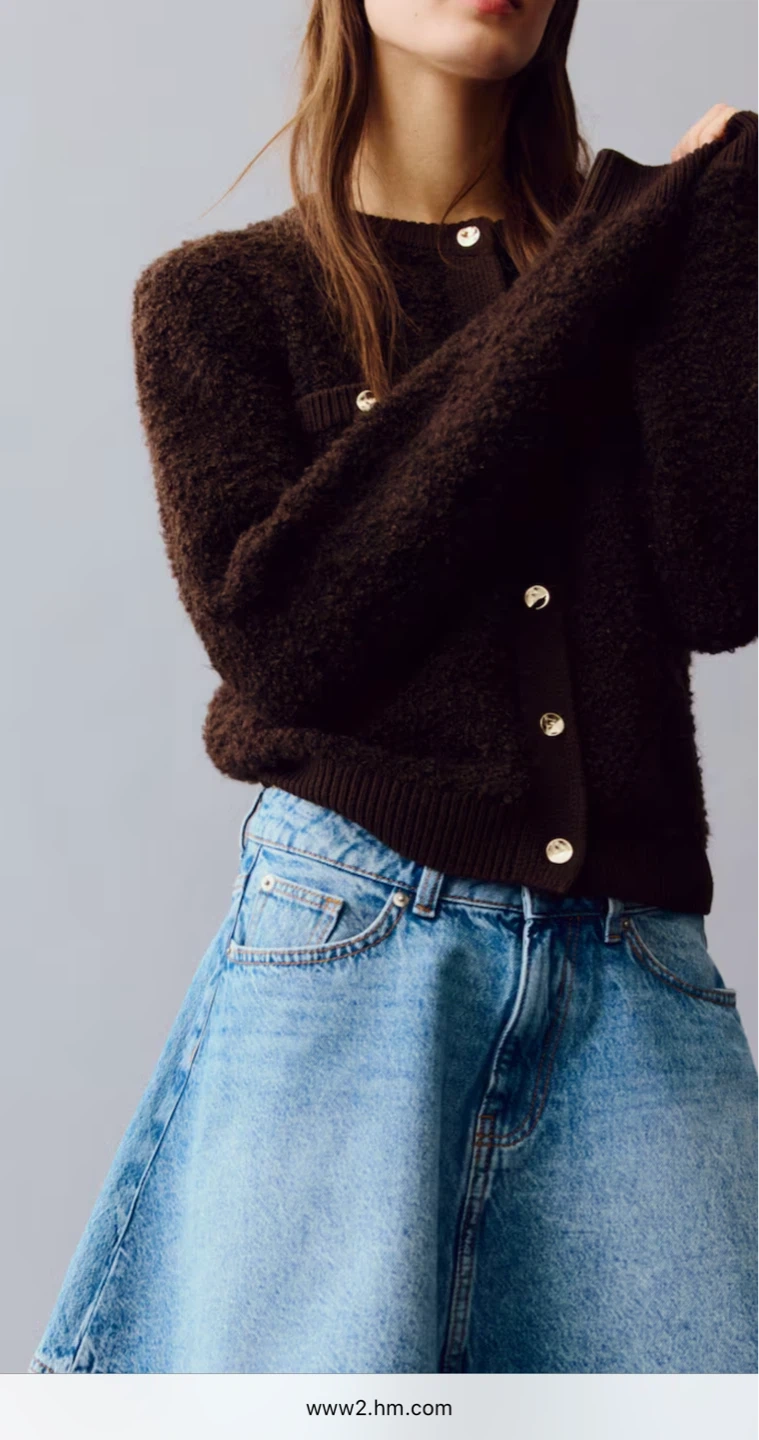 A H&M bouclé-knit cardigan in dark brown. This sweater has a textured finish and front button closure. It's a stylish layering piece for any outfit.