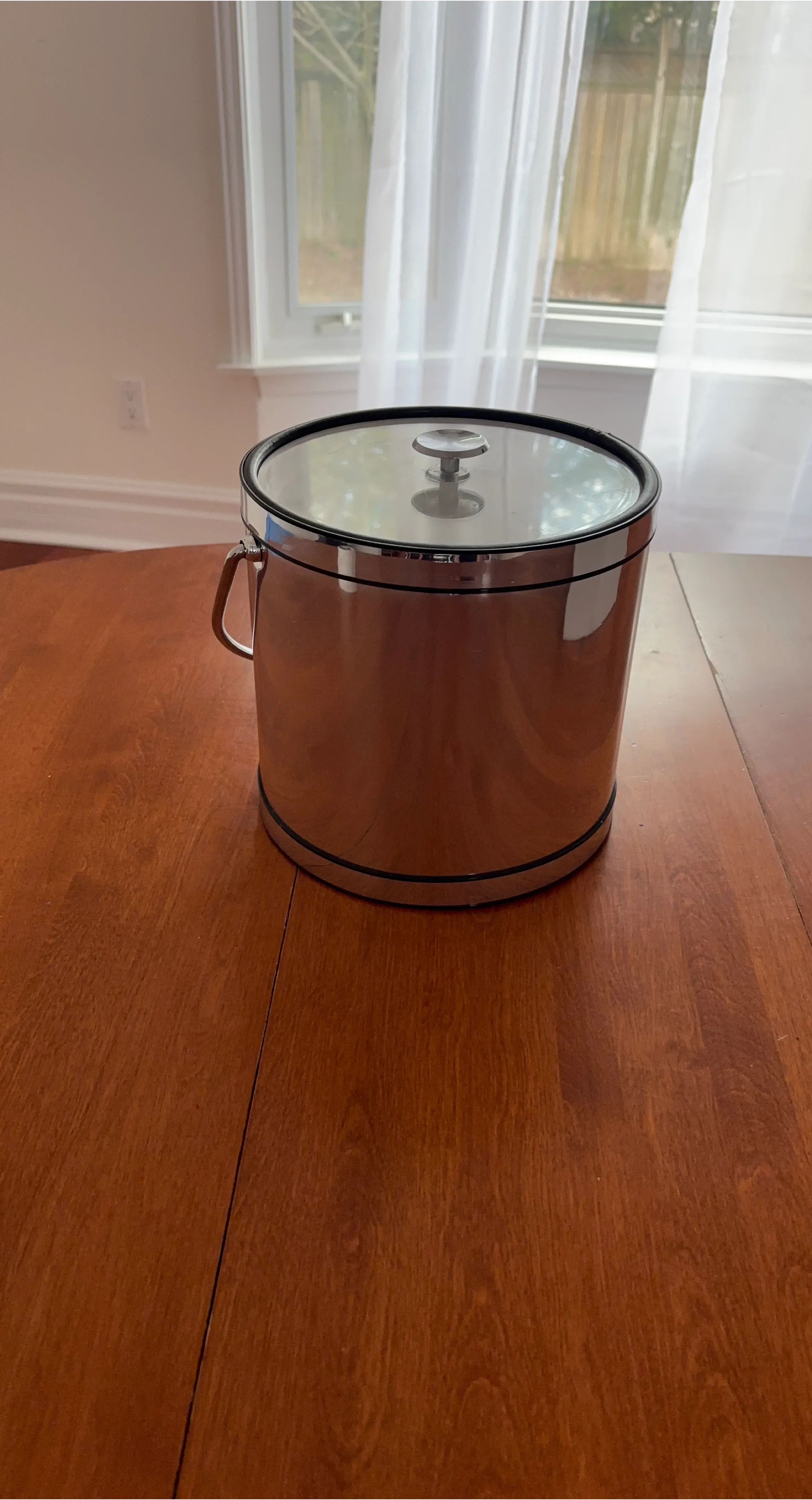 A durable stainless steel ice bucket designed to keep drinks cold. It features a clear glass lid with a handle for easy access. This ice bucket is perfect for entertaining or for keeping beverages chilled at gatherings.