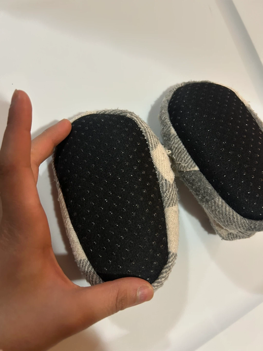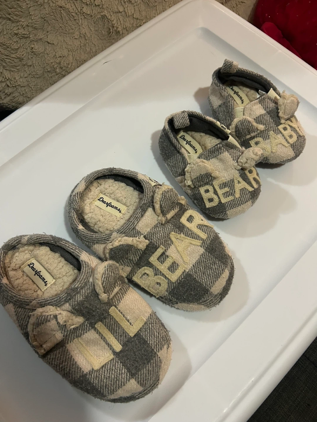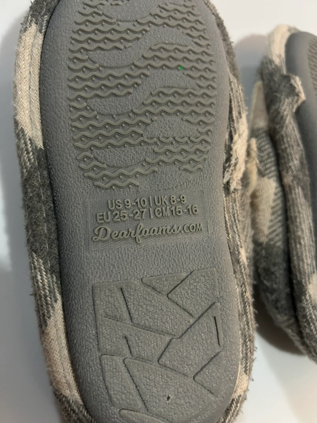 Cozy Dearfoams slippers for kids with a cute bear design. Features a plaid pattern and non-slip soles for safety. It's a size US 9-10. Perfect for keeping little feet warm!