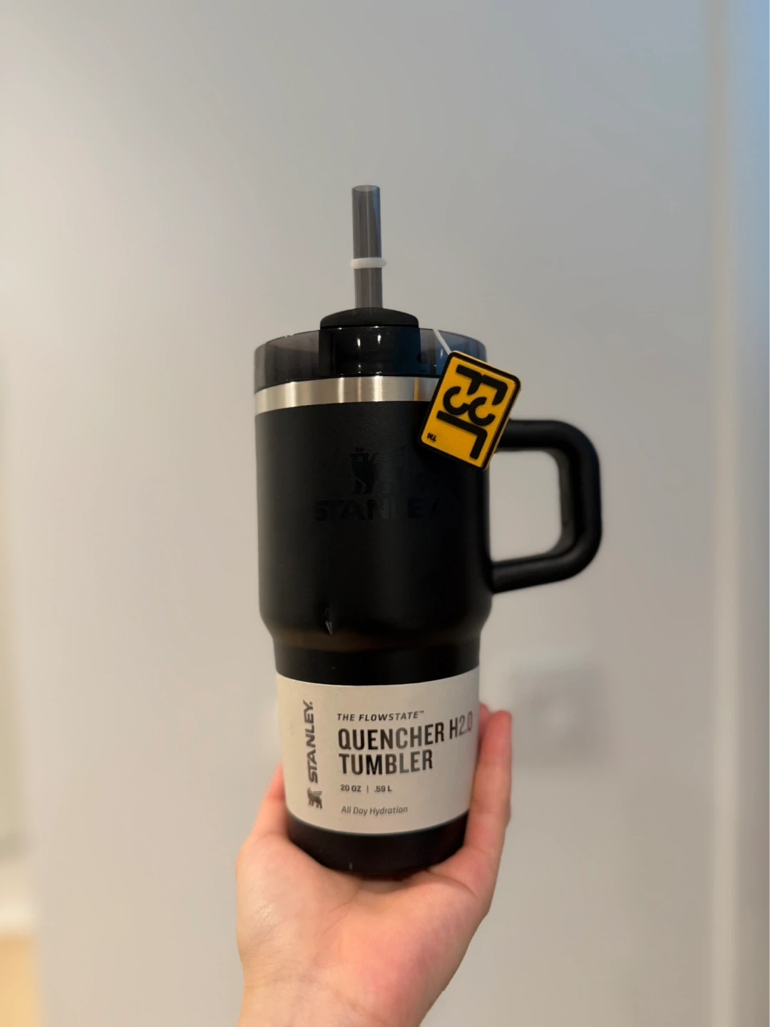 This is a Stanley FlowState Quencher H2.0 Tumbler. It's 20 oz and holds 591 ml. Made for all-day hydration. Comes with a reusable straw.