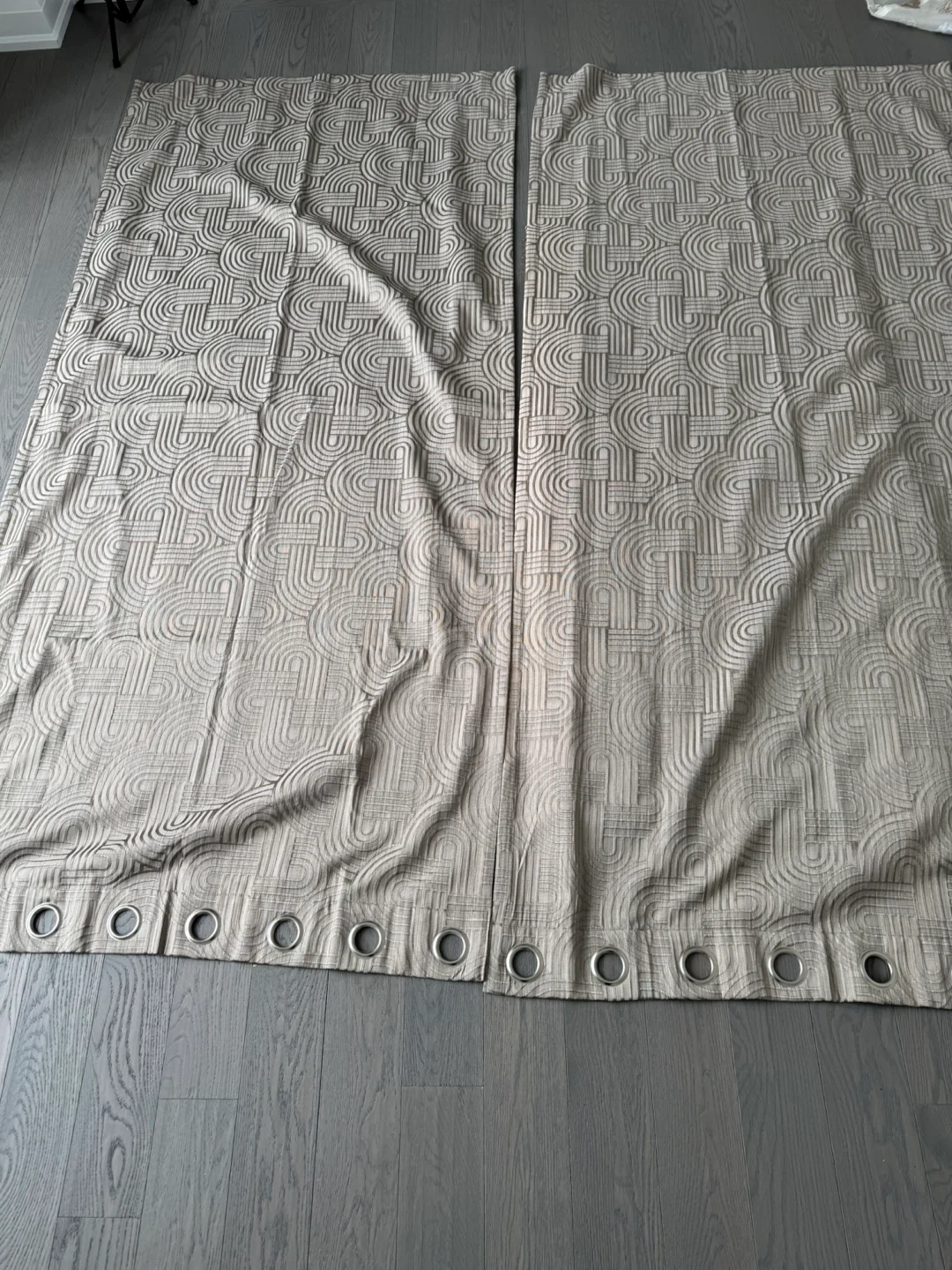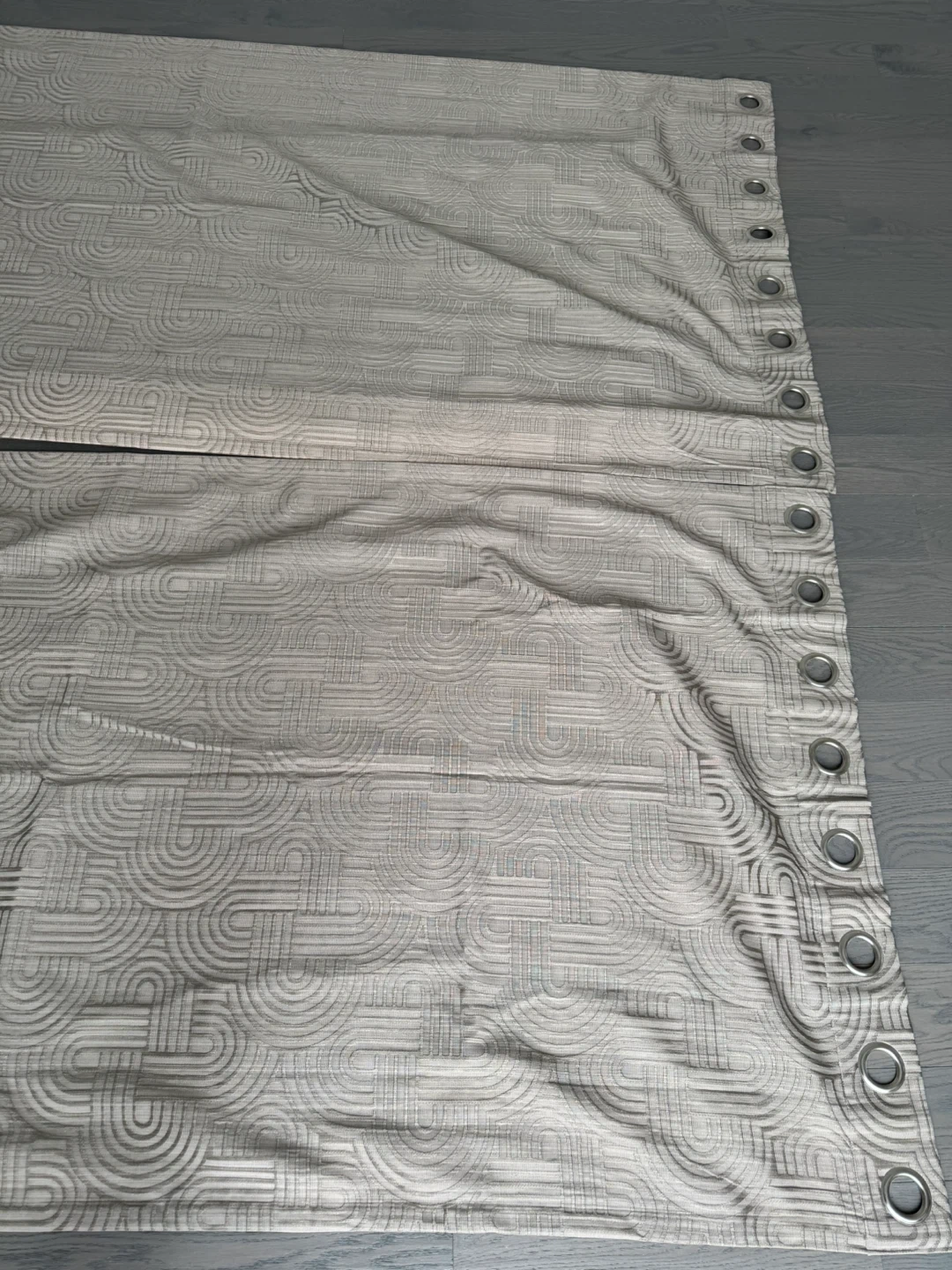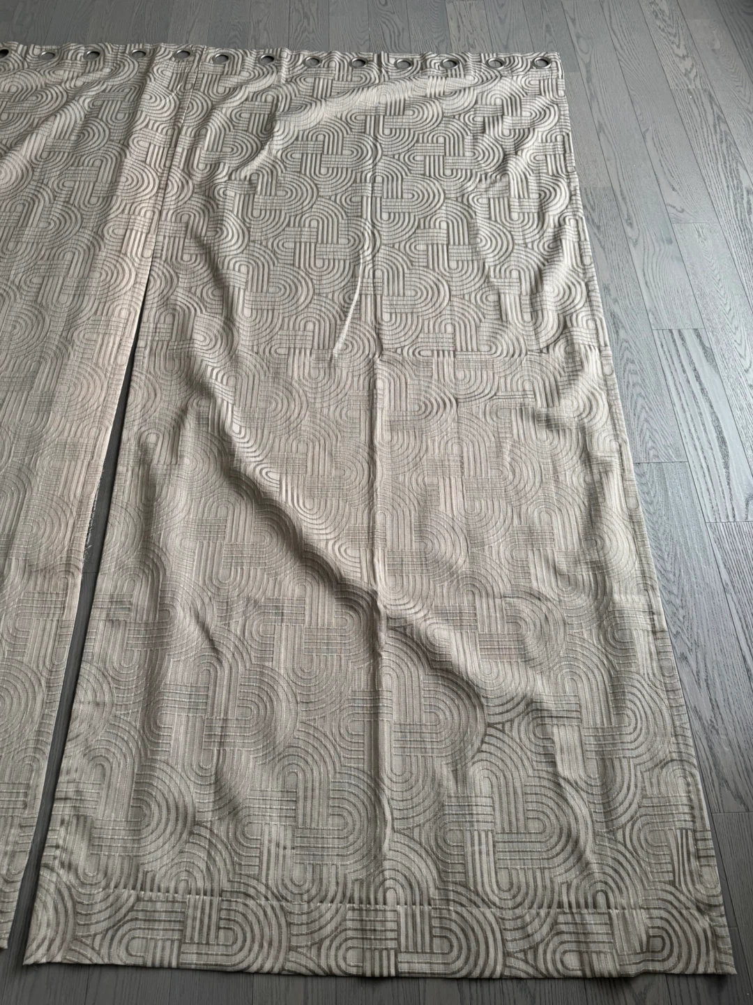 A pair of neutral-toned curtains featuring a raised geometric pattern. They're made from a durable fabric and have grommets for easy hanging. These curtains would add a stylish touch to any room.