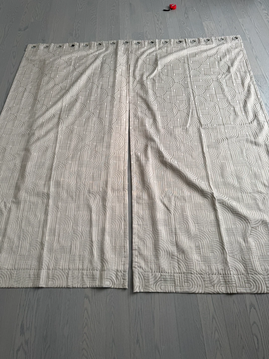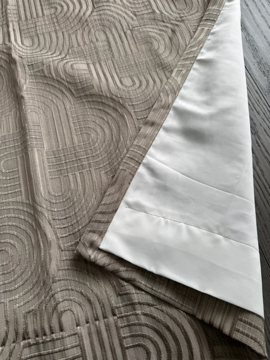 A pair of neutral-toned curtains featuring a raised geometric pattern. They're made from a durable fabric and have grommets for easy hanging. These curtains would add a stylish touch to any room.