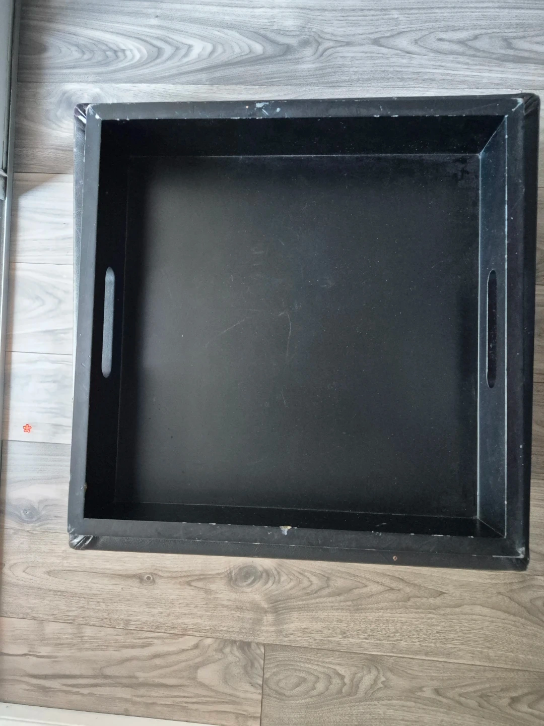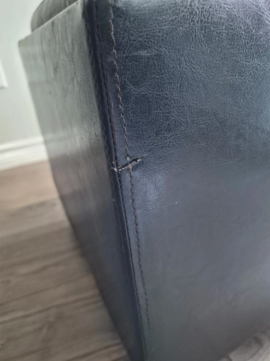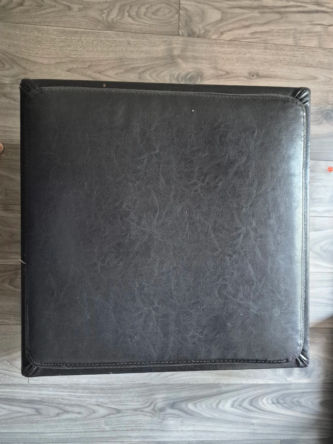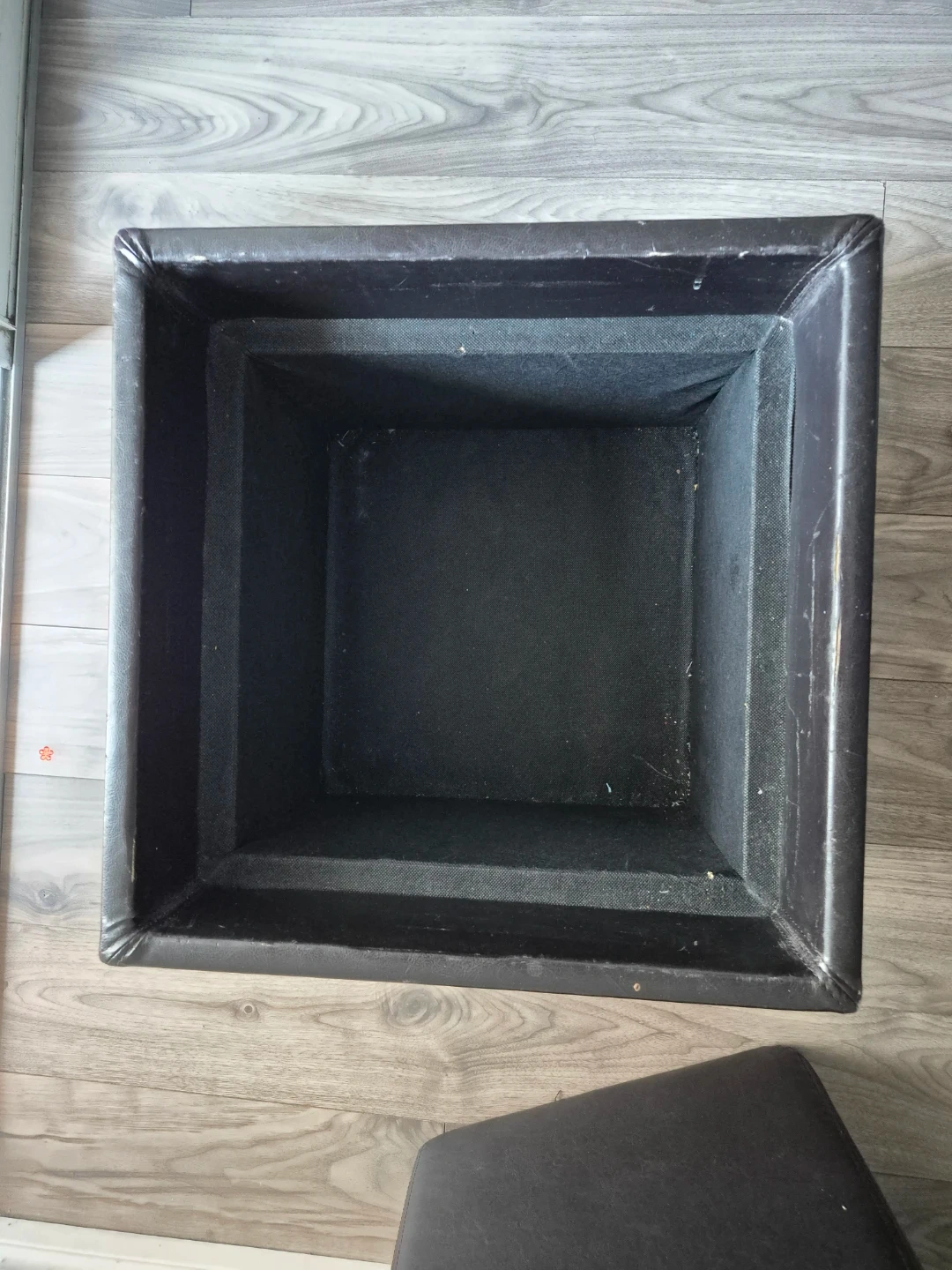 This is a black storage ottoman with a faux leather exterior. It's great for extra seating or to keep your space tidy. The lid lifts for convenient storage inside. Perfect for a living room or bedroom!