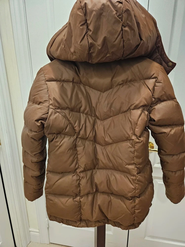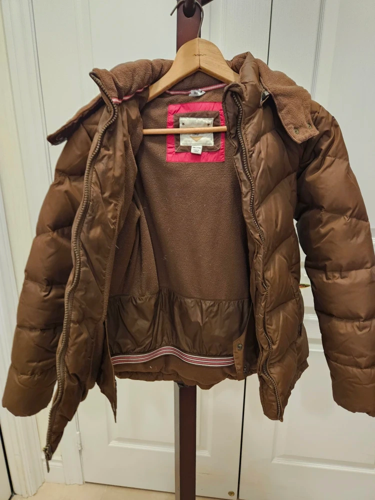 Selling a Girls Gap puffer jacket in brown. The size is XXL. It's in great condition and perfect for keeping warm during the colder months! It is a real warm jacket. Good for an 8 year old to 10 year old (depending on size of child).