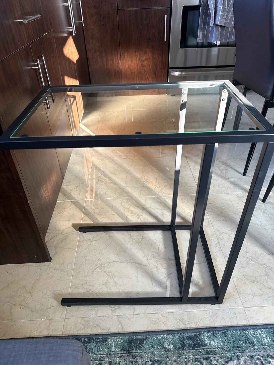 A modern C-table featuring a clear glass top and a black metal frame. It's designed for easy placement next to sofas or chairs. The frame is made of sturdy metal.