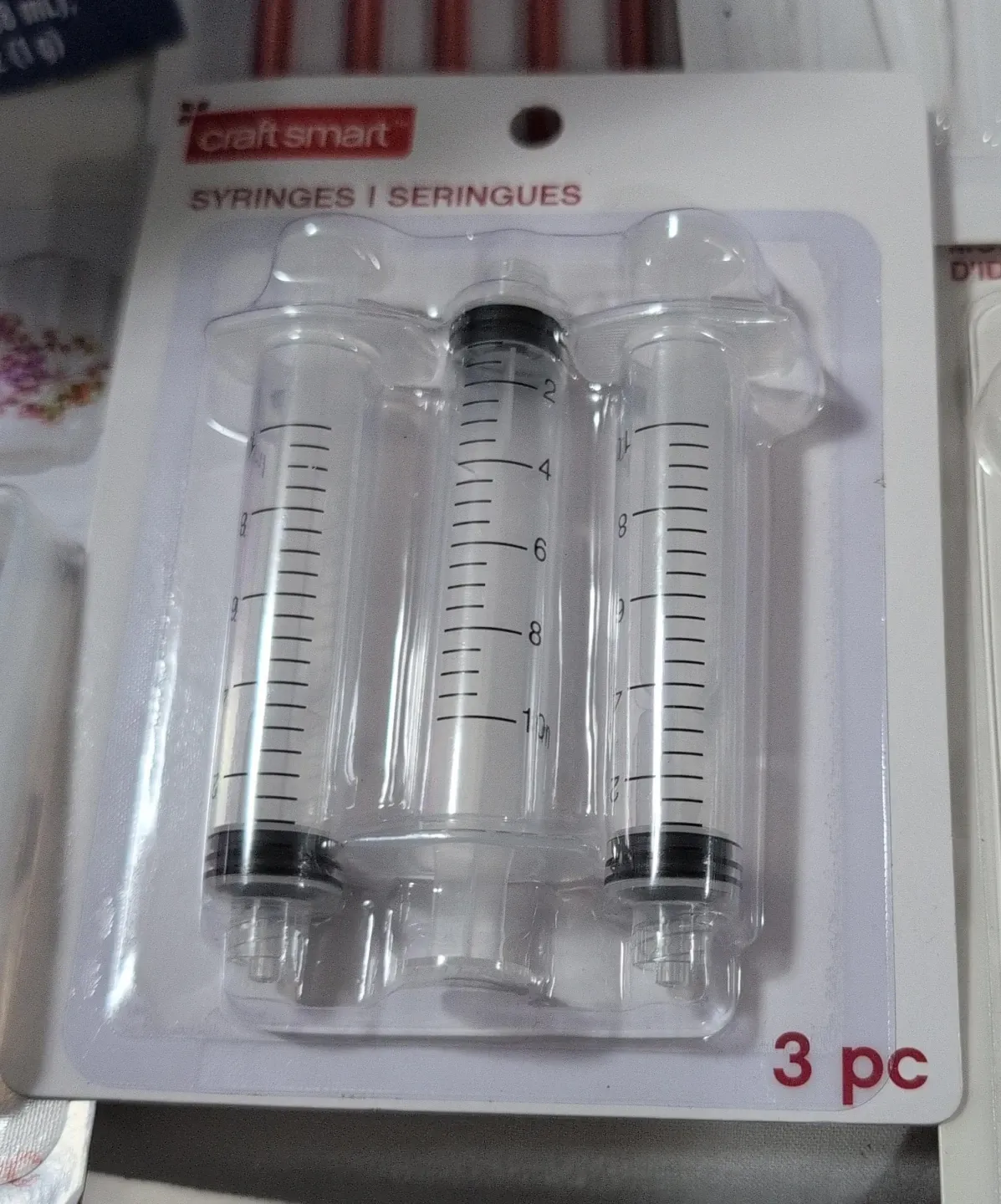 These are three Craft Smart syringes, each marked with measurements up to 10ml. They're sealed in their original packaging. The package clearly states '3 pc'.