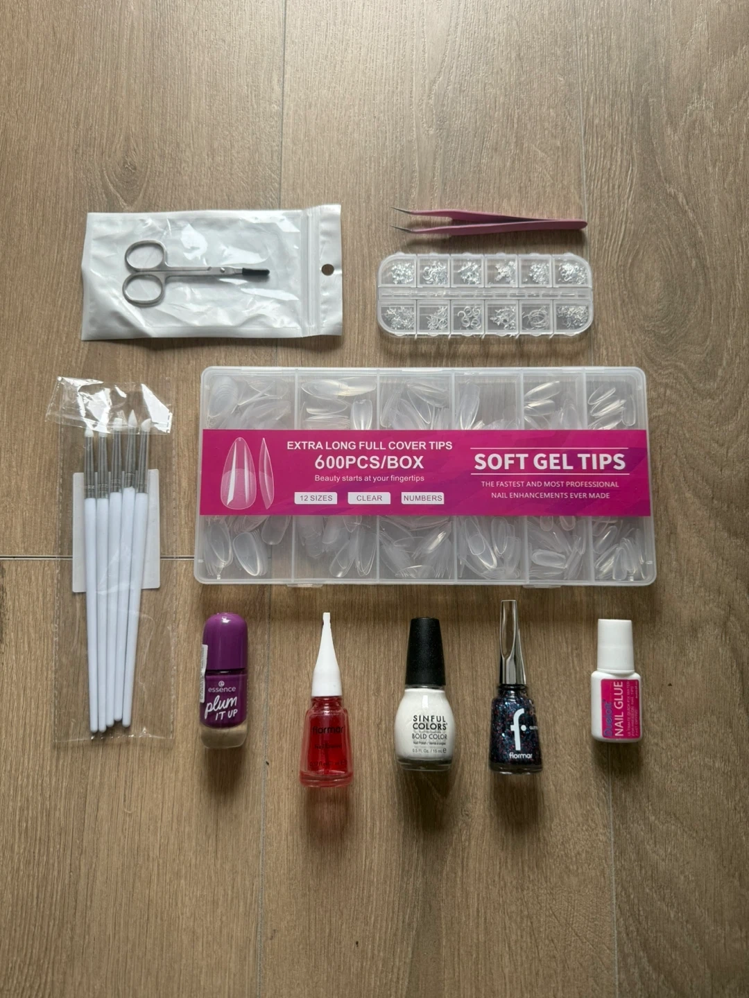 Includes extra-long full cover soft gel tips in 12 sizes, nail glue, a set of nail art brushes, tweezers, nail decorations, and assorted nail polishes. Everything you need for professional nail enhancements at home! They are all never used except the flormar nail polishes. Im swlling them all since Im a student and don’t sell any of the items individually. The price is for all.