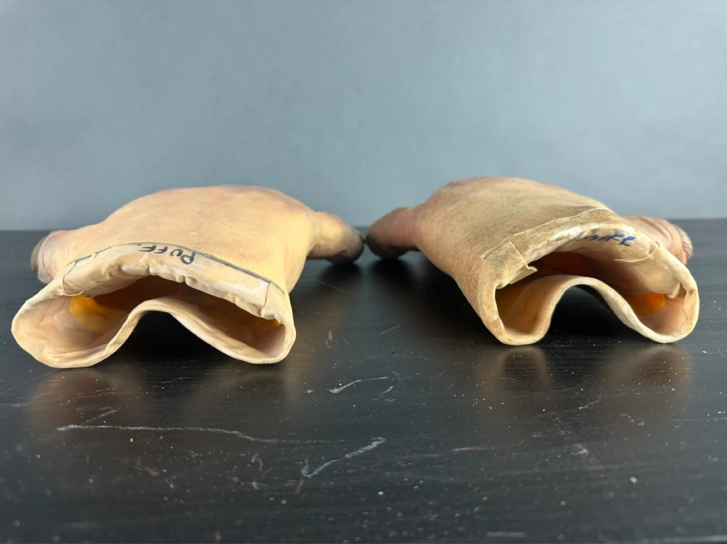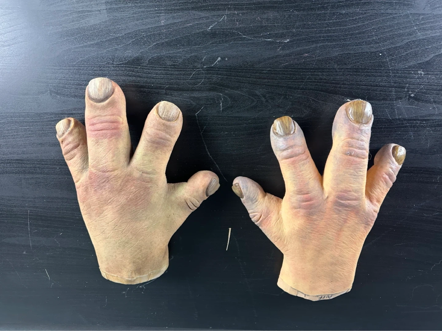 A pair of realistic hand gloves. They appear to be made of a latex or rubber material. These gloves are designed to look like human hands with detailed fingernails and skin texture. They'd be interesting for costume or theatrical use!