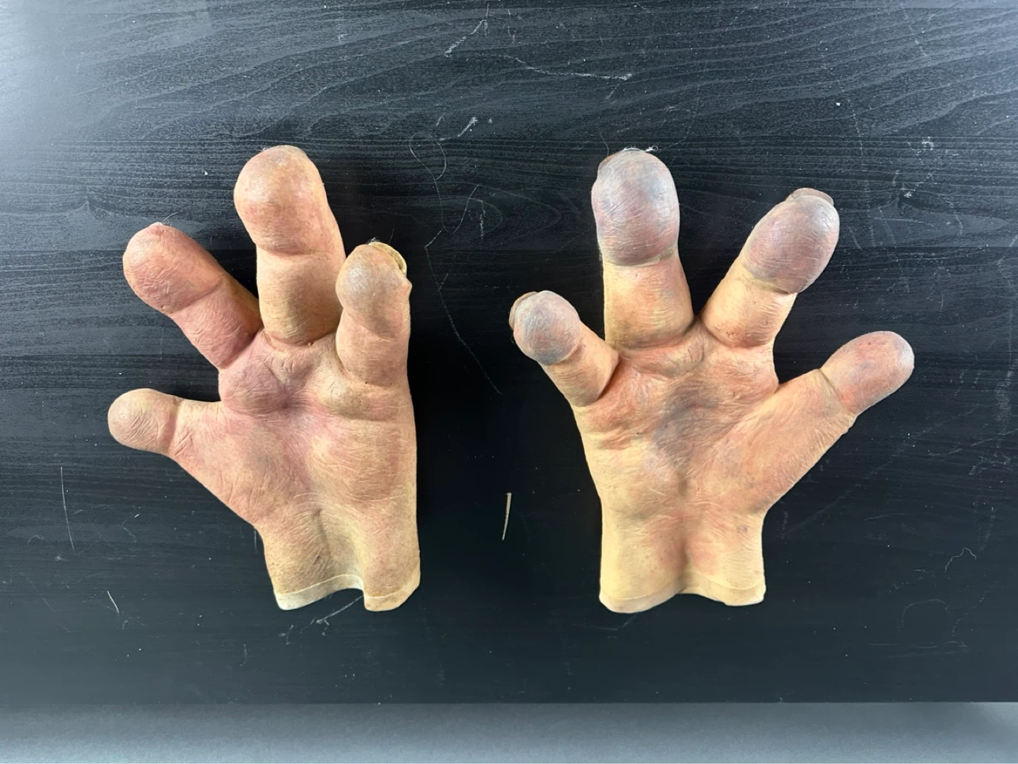 A pair of realistic hand gloves. They appear to be made of a latex or rubber material. These gloves are designed to look like human hands with detailed fingernails and skin texture. They'd be interesting for costume or theatrical use!