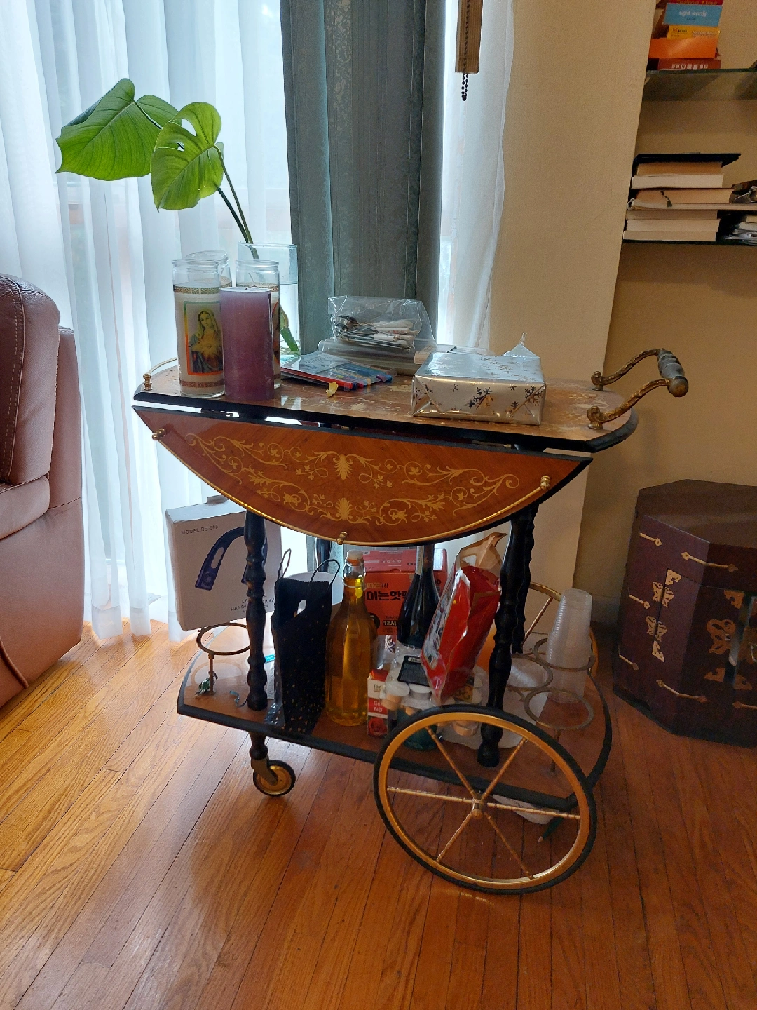 Selling a charming vintage bar cart! It has a unique design with a drop-leaf top, gold accents, and rolling wheels. Perfect for adding a touch of elegance to your home or for entertaining guests. It was made in Italy in 1998. It need to tighten screws.