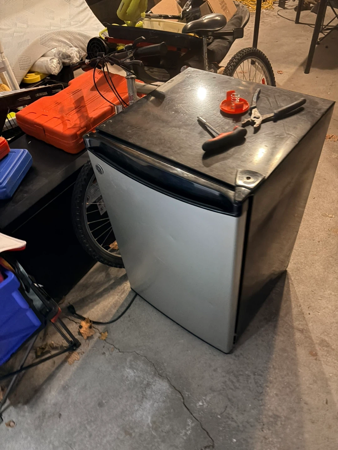 This compact mini fridge is a handy appliance for small spaces. It has a silver and black exterior. This would be useful for dorm rooms, offices, or as extra fridge space in a garage.