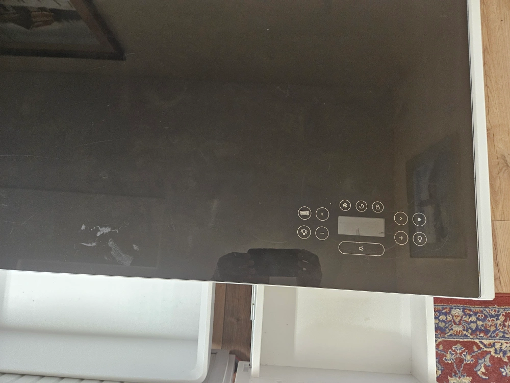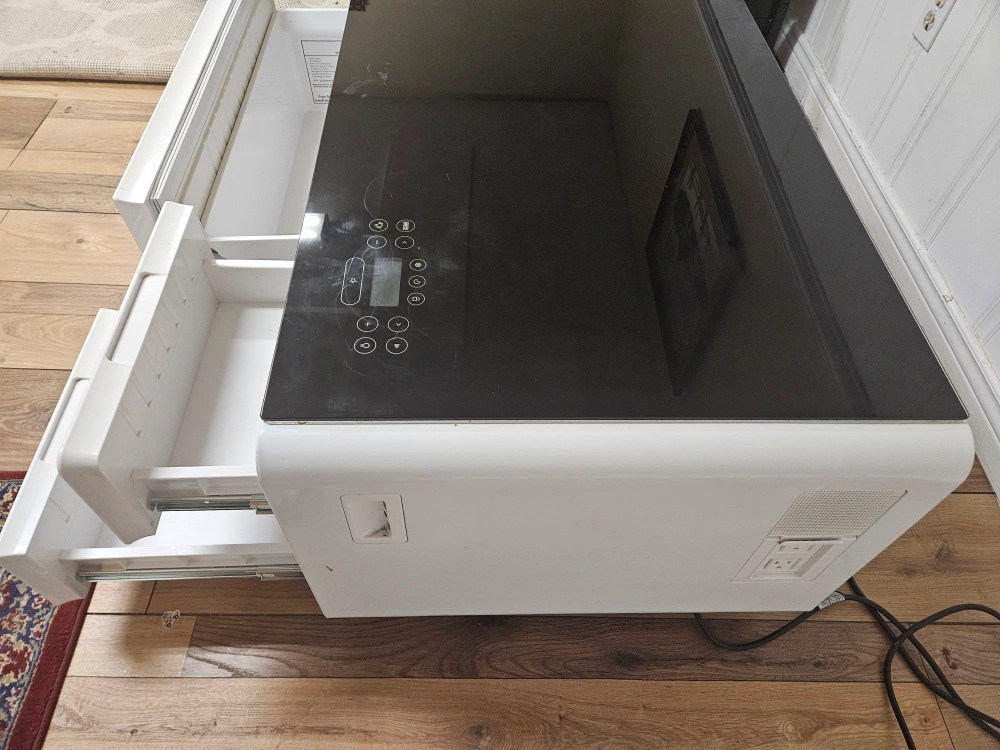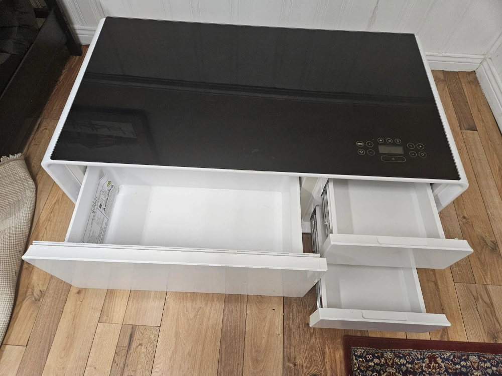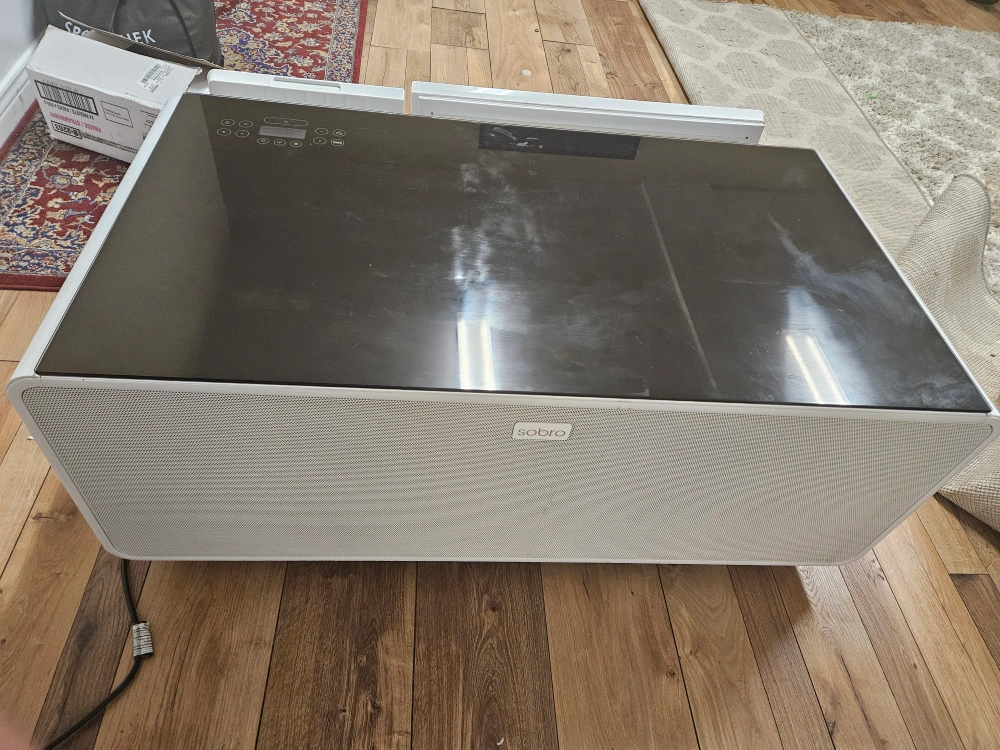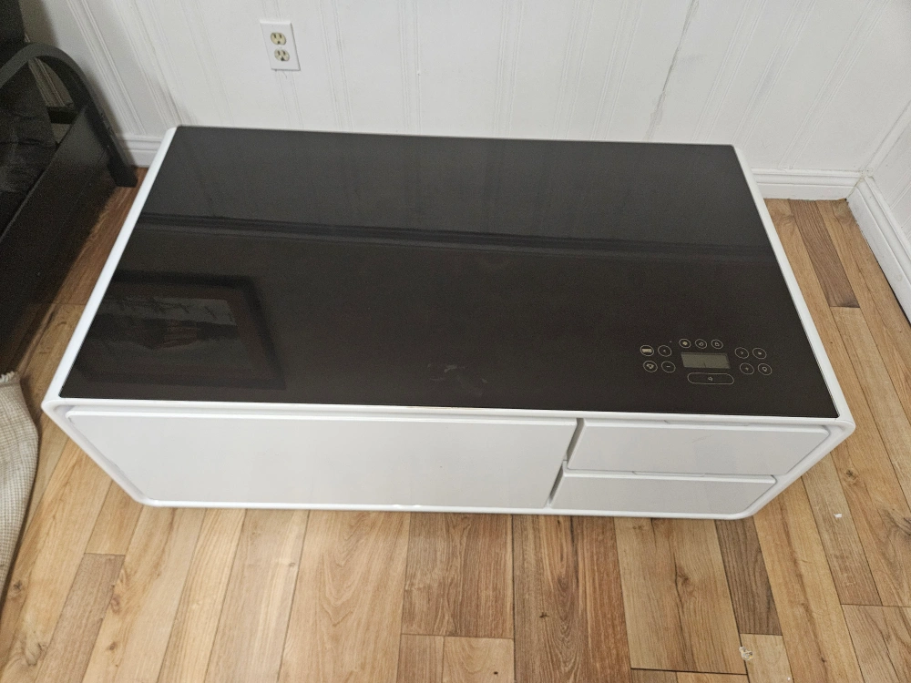 Selling a Sobro Smart Coffee Table in white! This unique table features a built-in refrigerator drawer, perfect for keeping drinks and snacks cold. It also has integrated Bluetooth speakers, LED lighting, and touch controls on the glass top. It also has drawers for storage. A great addition to any living room!