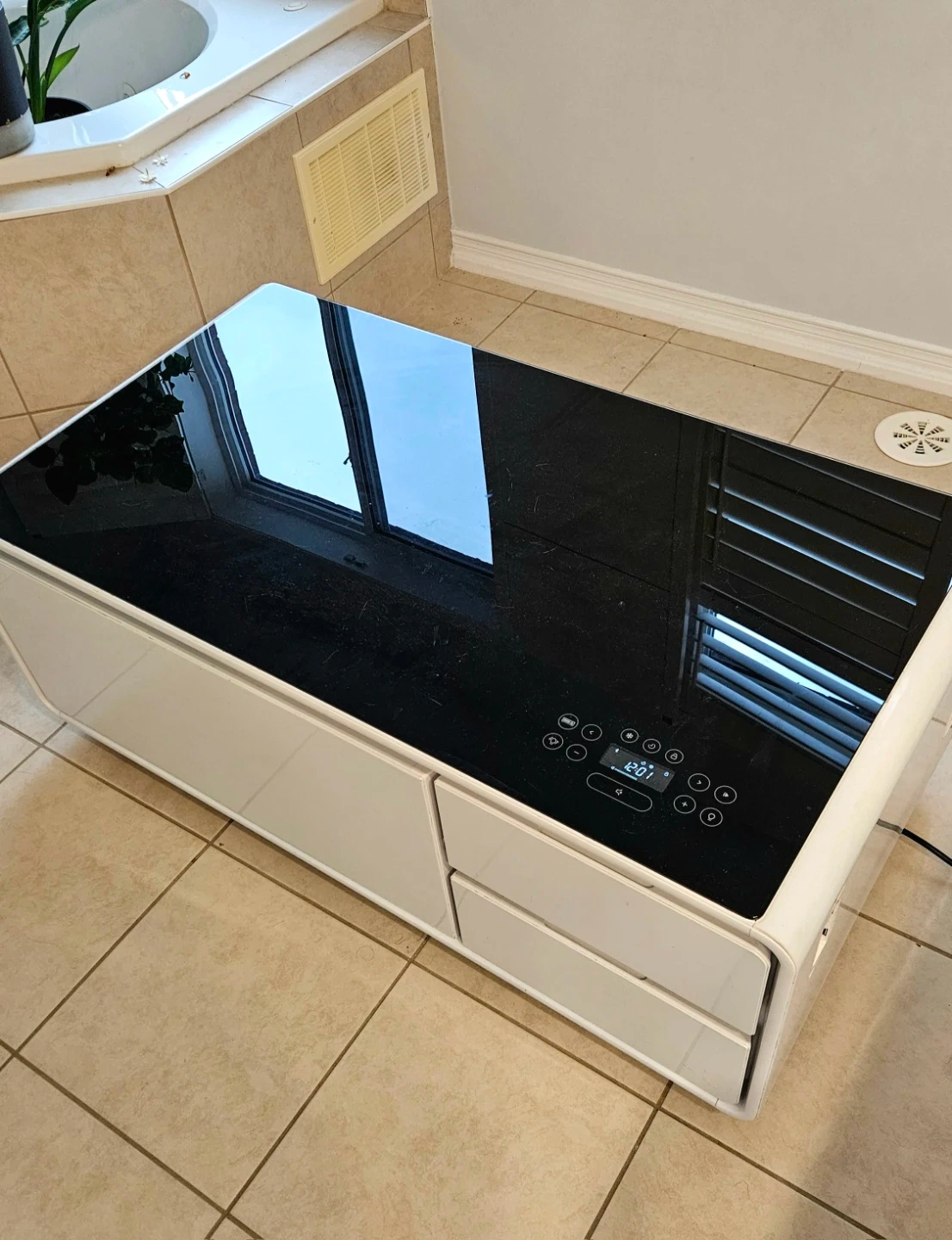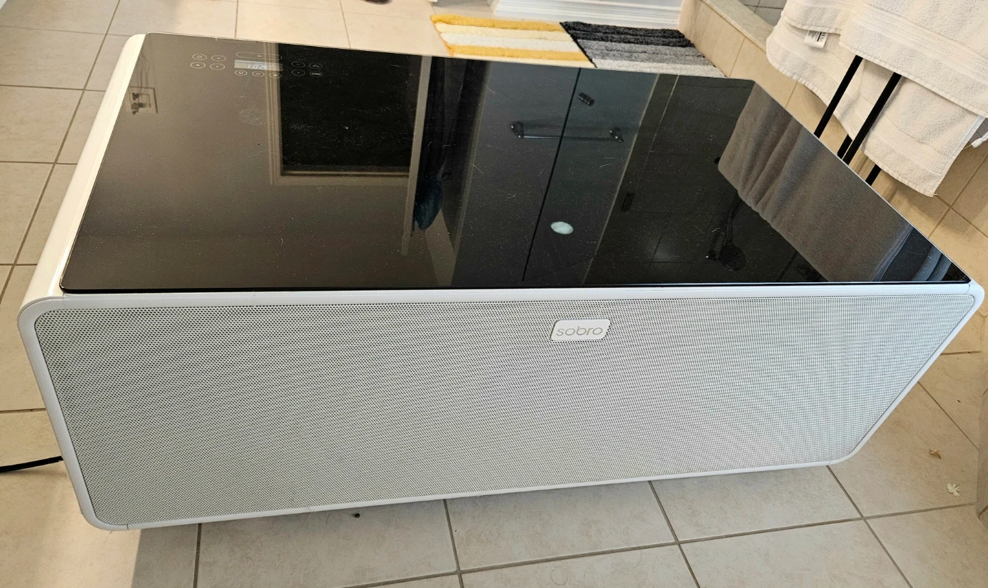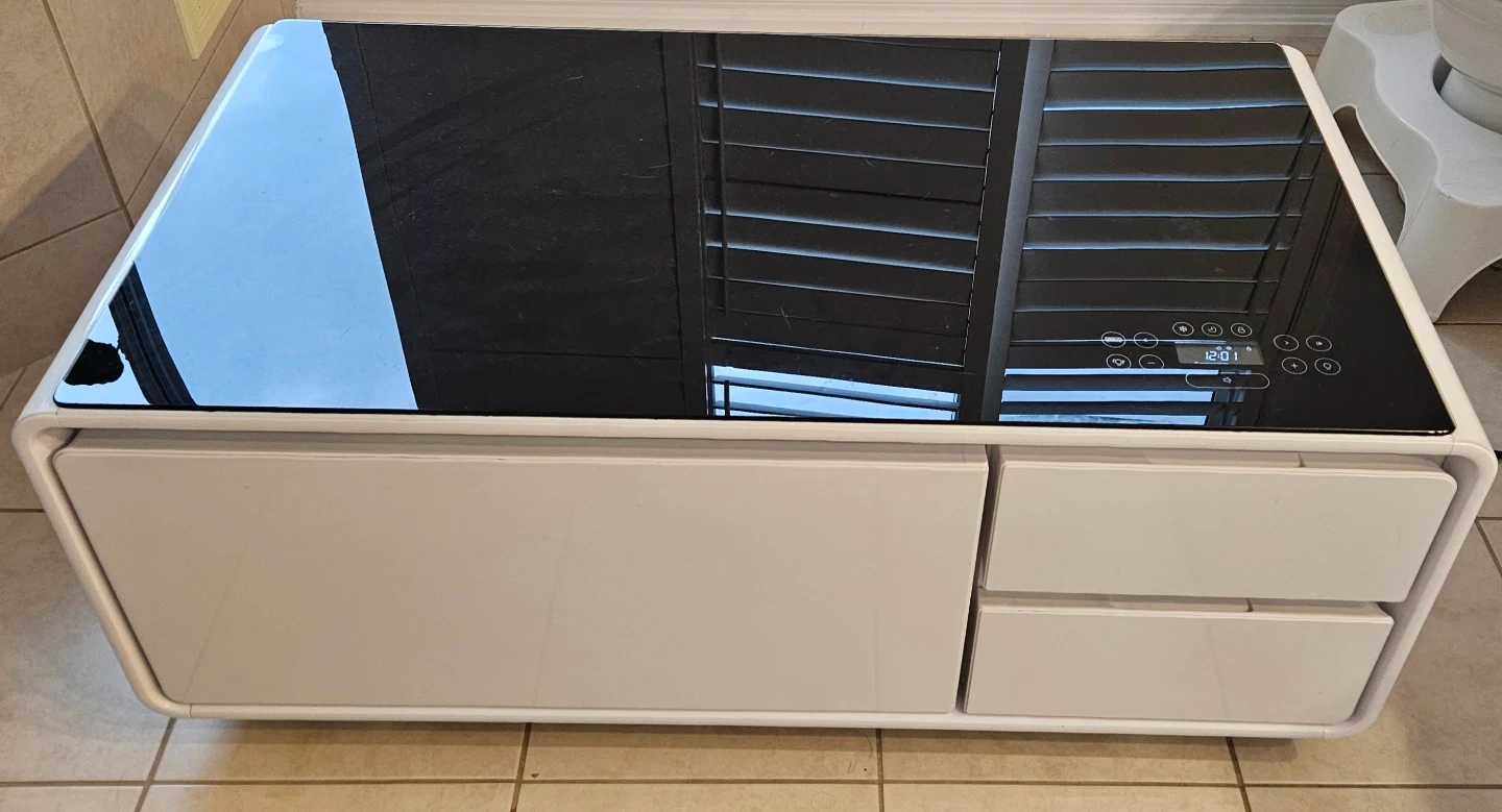 65Selling a Sobro smart coffee table in white! It features a built-in refrigerator, Bluetooth speakers, LED lights, and touch controls on the tempered glass top. Great for entertaining or just relaxing at home. Sold as it is. Pick up only.