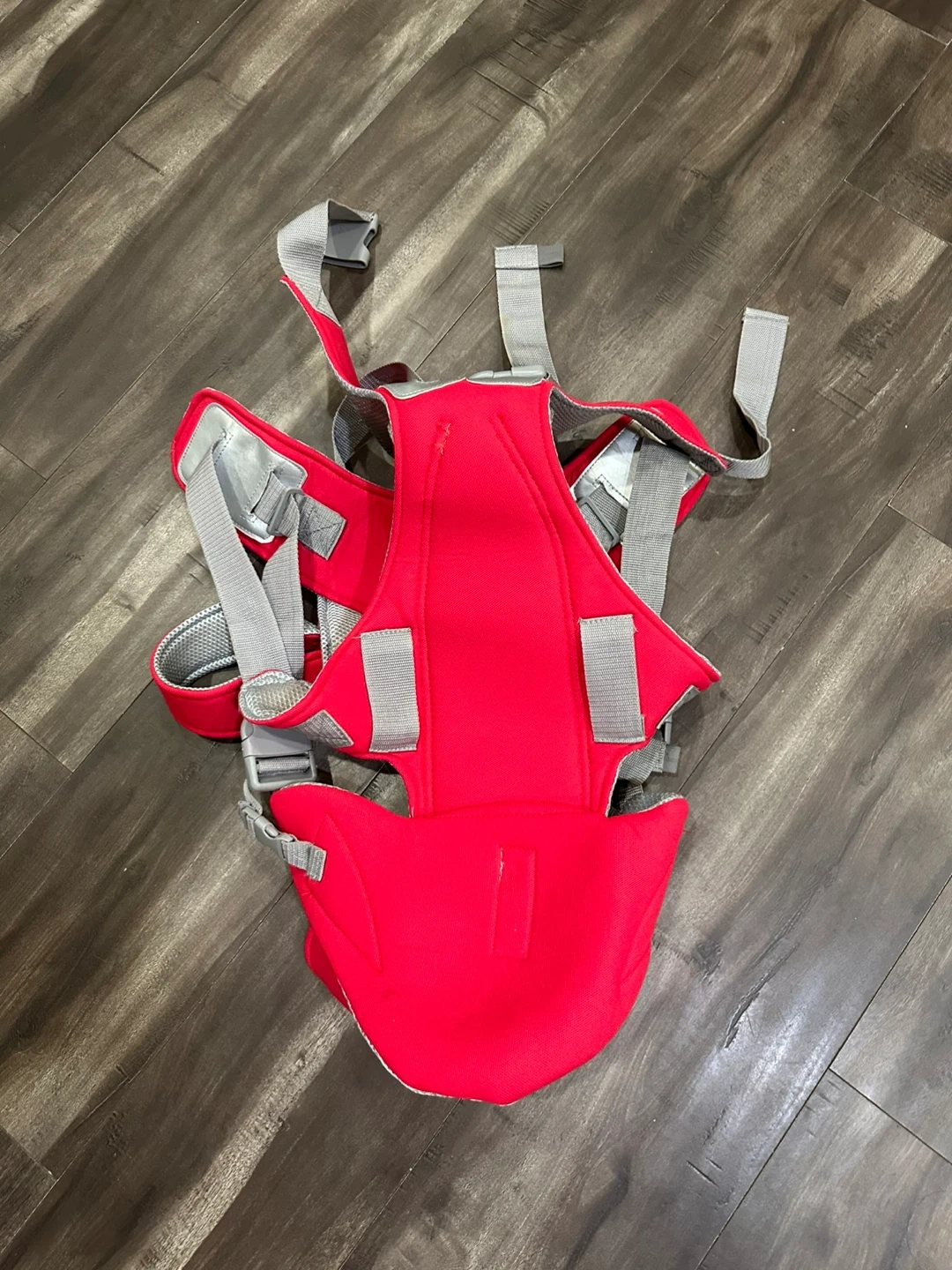 This is a red baby carrier with grey mesh accents. It includes adjustable straps for a comfortable fit. It's designed for carrying infants.
