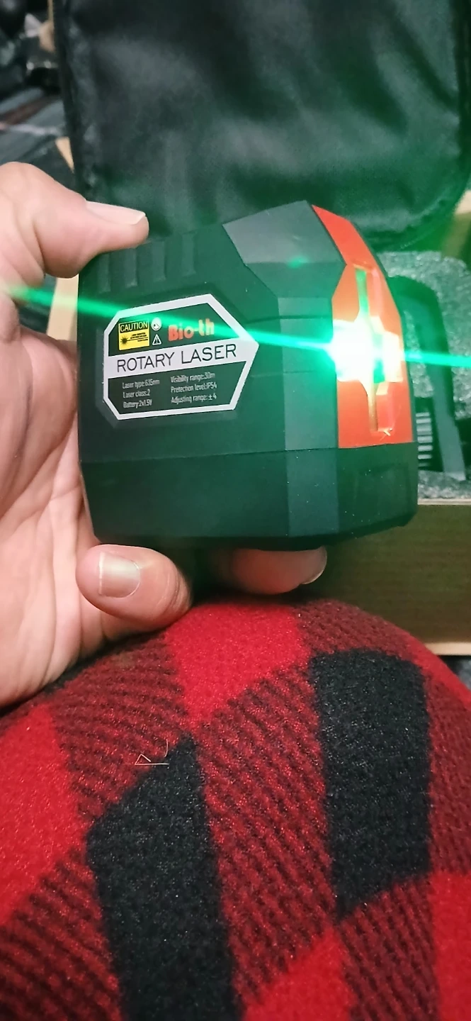 This is a Bio-Th rotary laser level. It's green and comes with its original case and accessories. Includes a bracket and a small tripod adapter.