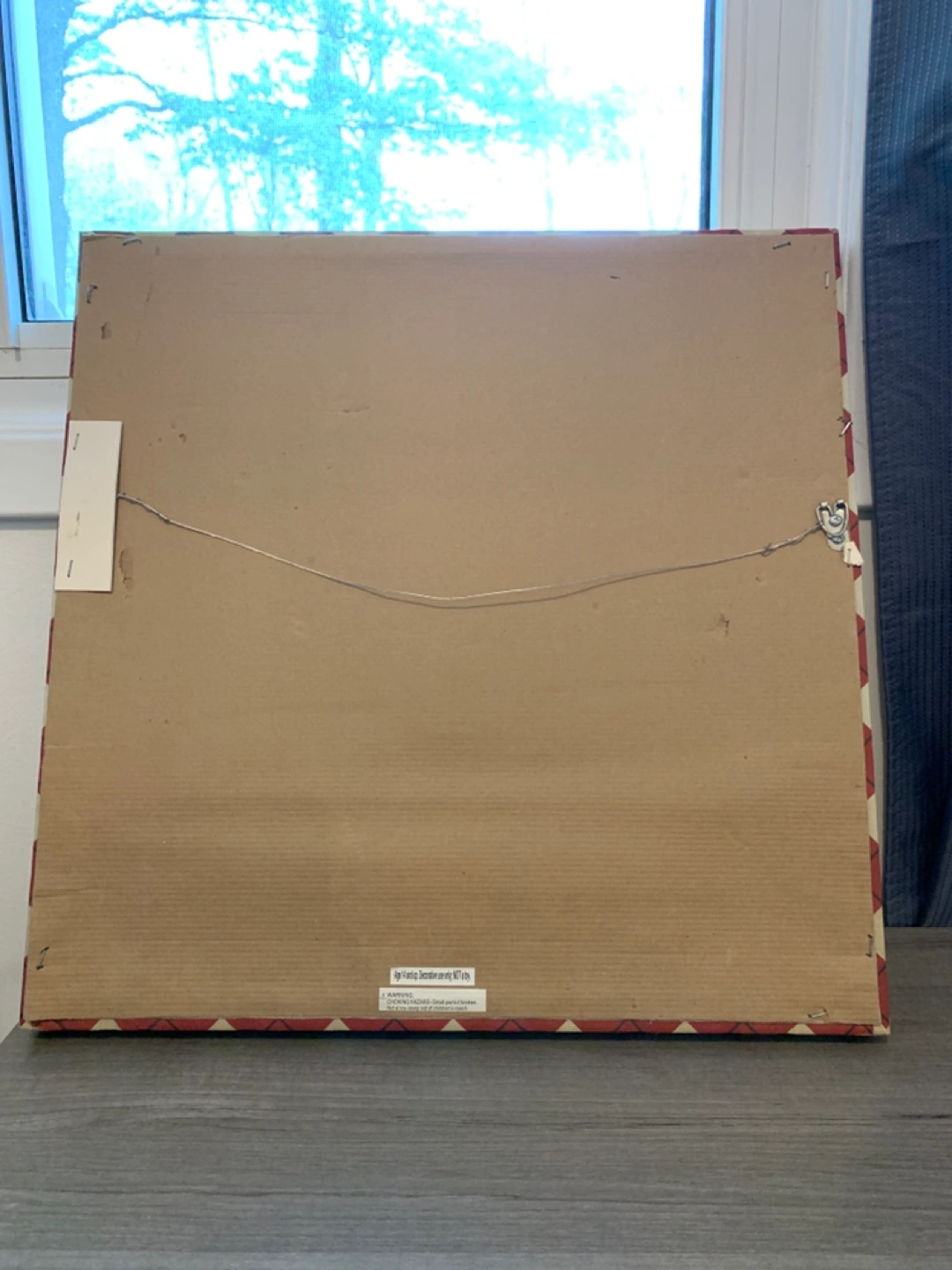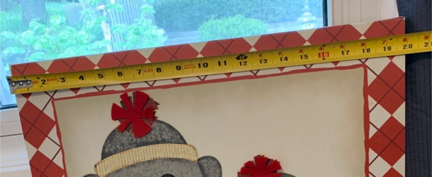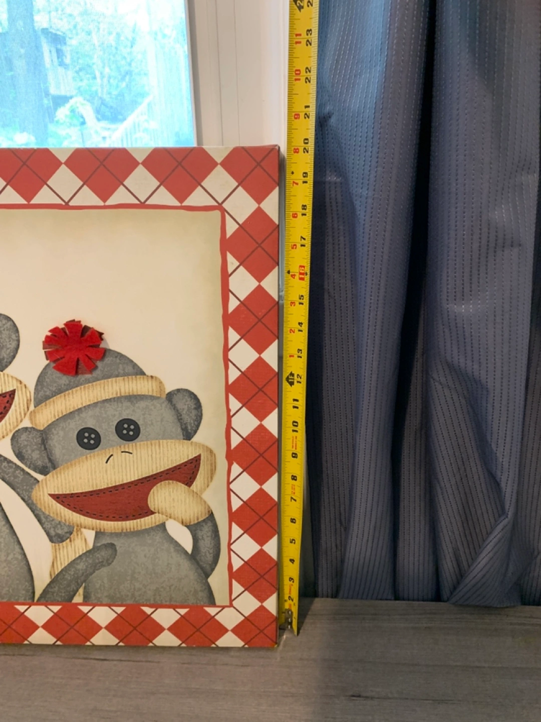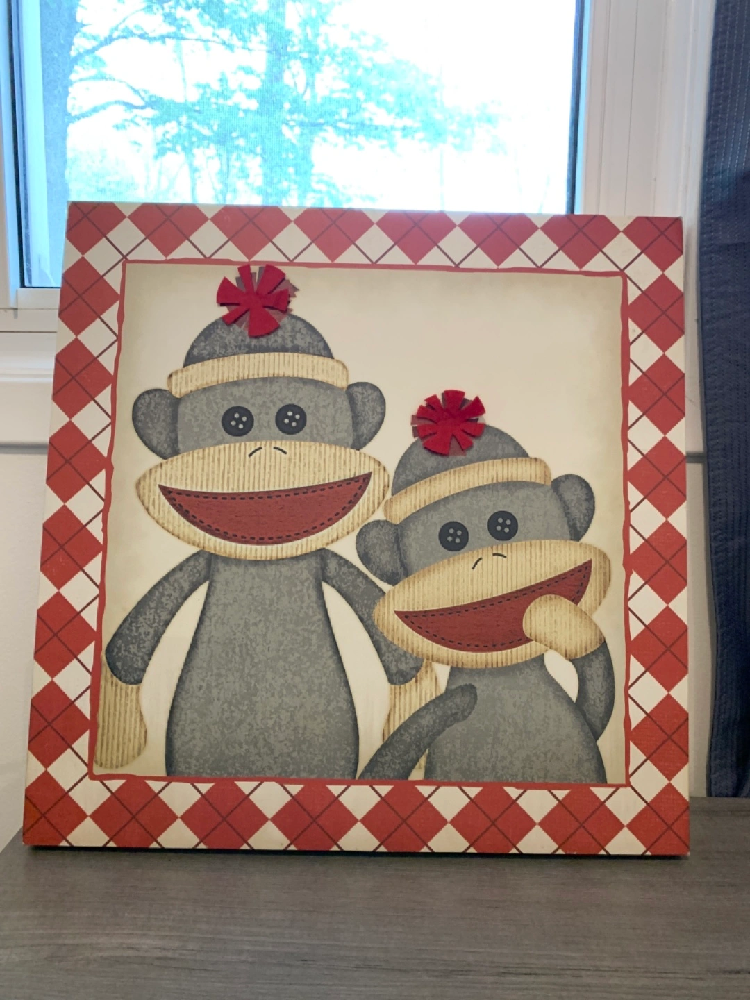 Picture features two sock monkeys with red accents. Framed picture with a diamond pattern. Measurements in picture. In great condition. A good choice for adding a playful touch to any kids room.