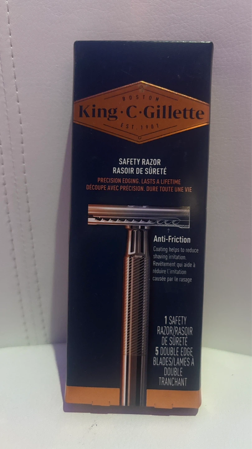 King C. Gillette safety razor set. Includes 1 safety razor and 5 double edge blades. Features precision edging and anti-friction coating for a smoother shave. This razor is designed for a close and comfortable shave.
