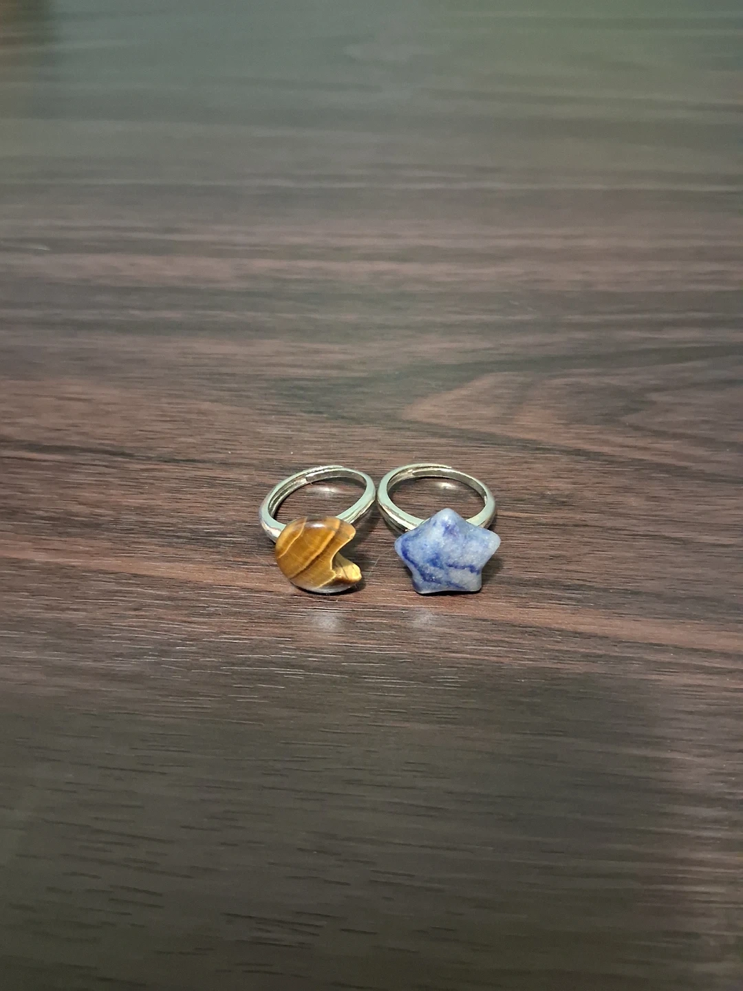 597Selling a cute ring set! One ring features a Sodalite star, also known as Canadian Blue Stone, set in a silver-tone adjustable band. The other ring features a Tiger's Eye stone, a variety of Quartz, also set in a silver-tone adjustable band. Both are considered healing stones!