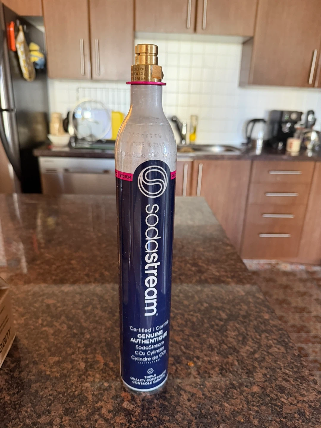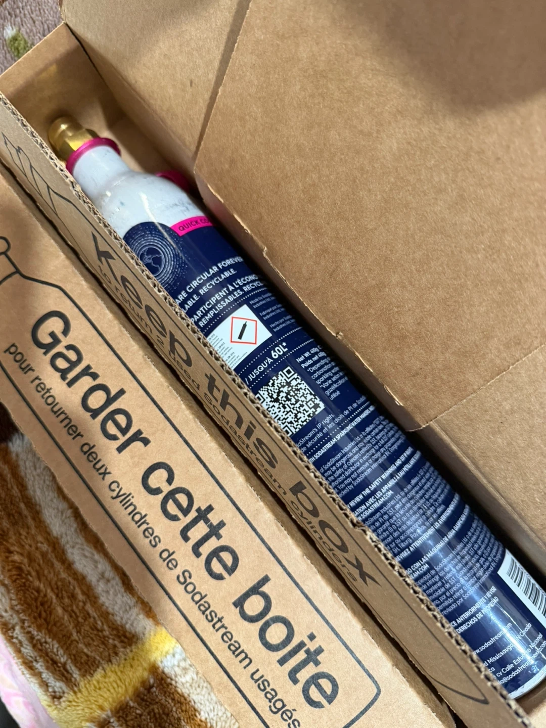 Selling a SodaStream CO2 cylinder. Bought these 2 bottles by accident (the valve is not compatible with my device), so it’s not used or even out of packaging.It comes with its original box. This cylinder makes up to 60L of sparkling water. Perfect for anyone who loves making their own bubbly drinks at home!