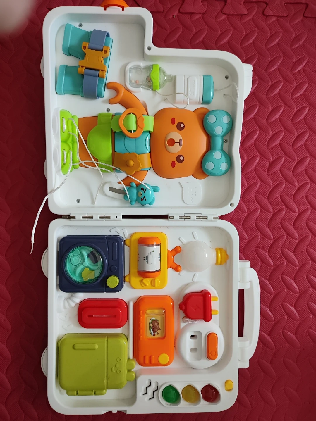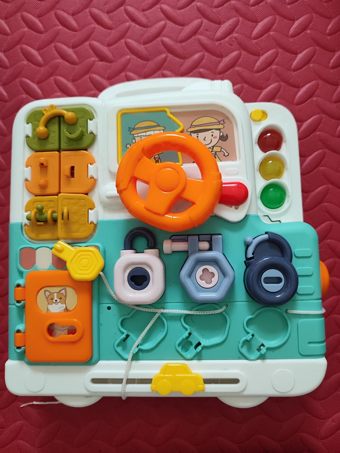 This busy board toy car offers various interactive activities. It's designed to develop fine motor skills with locks, latches, and gears. The toy also includes a steering wheel and a light-up bulb for engaging play.
