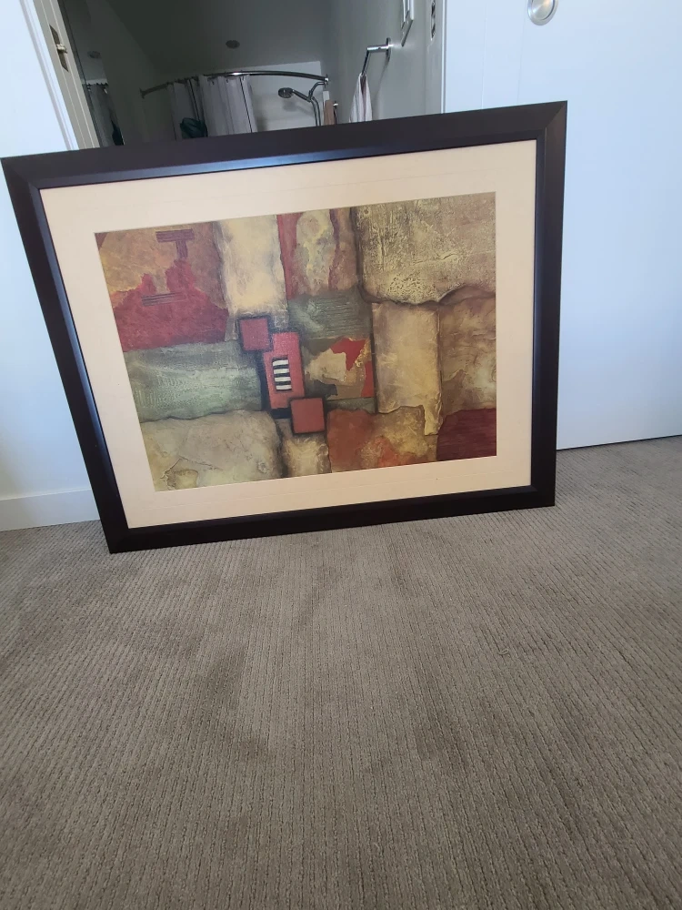 Framed abstract print with a textured look. The art features a palette of earthy tones with pops of red and black. It's ready to hang and would complement various decor styles. 112 cm X 86cm
