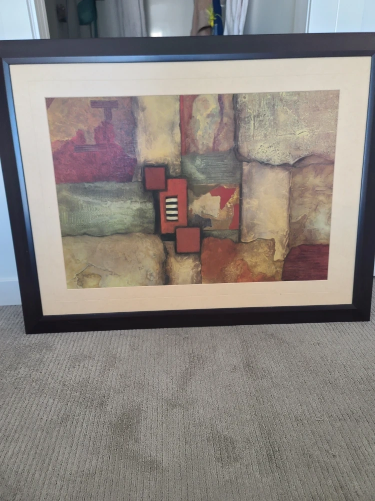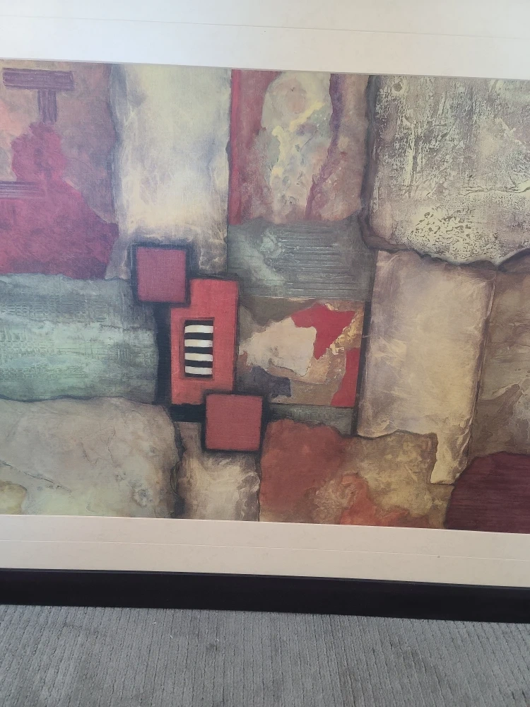 Framed abstract print with a textured look. The art features a palette of earthy tones with pops of red and black. It's ready to hang and would complement various decor styles. 112 cm X 86cm