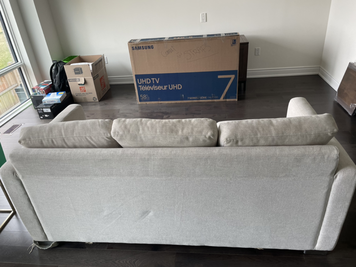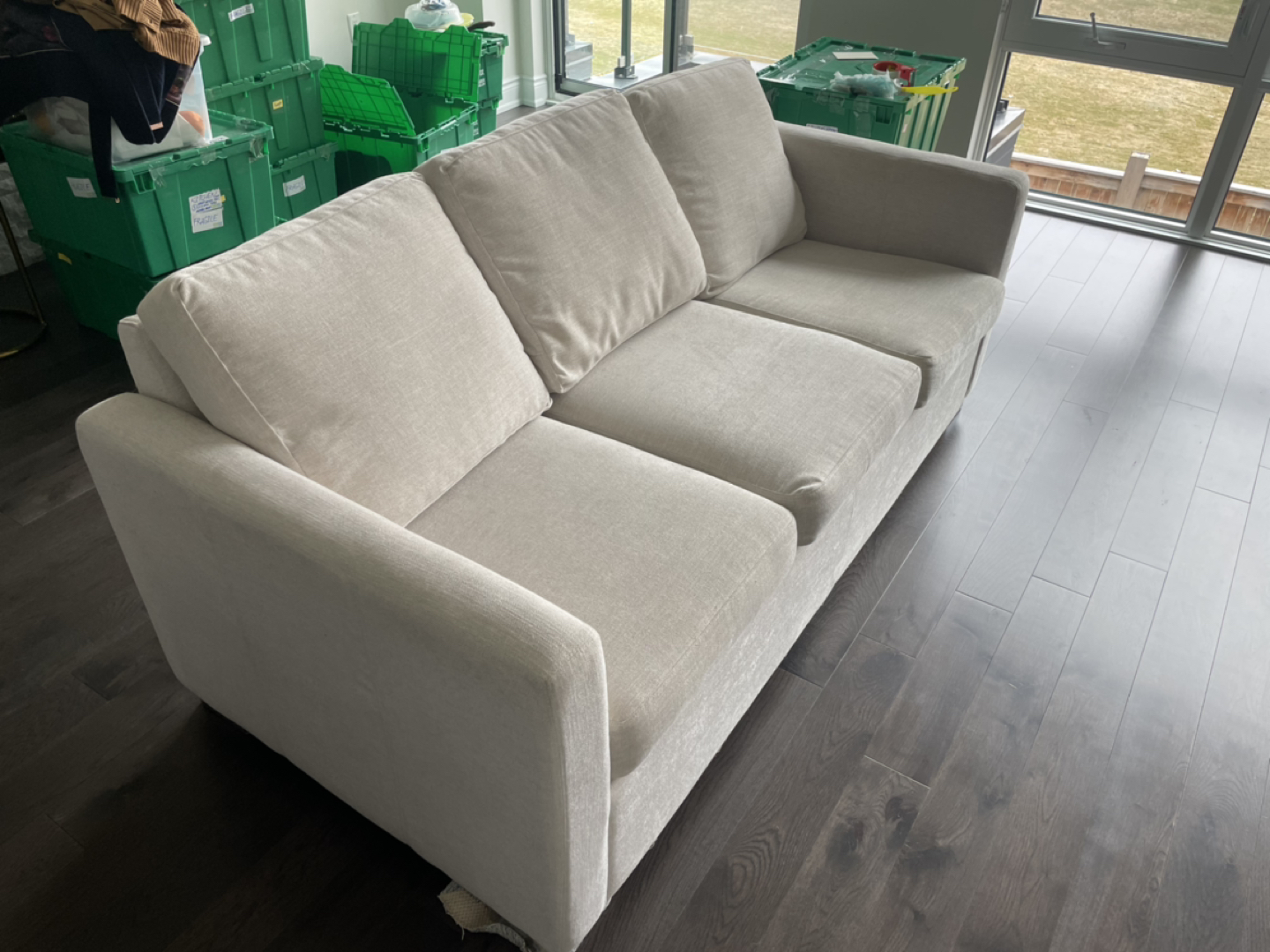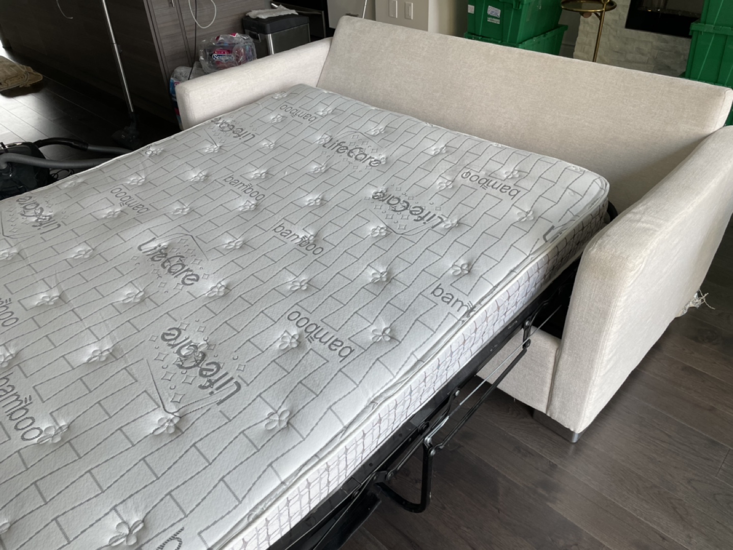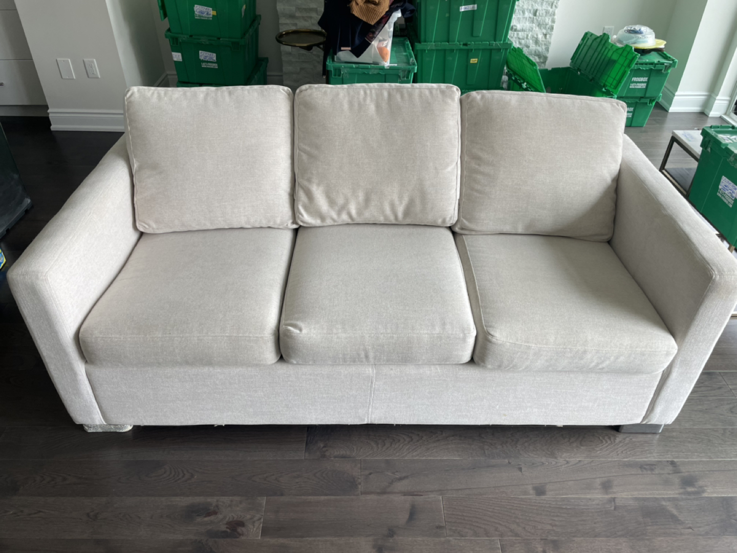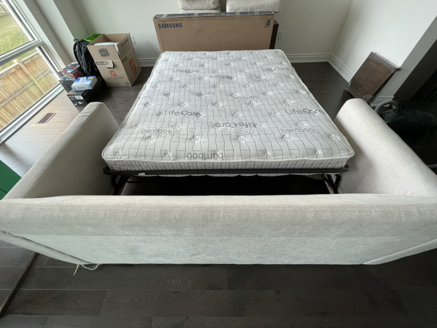 WxDxH: 76x37x32 Fabric Sofa Bed with a double mattress. Originally purchased at Design Republic for $1400+ Great as a couch for a small room or basement and as a guest bed when needed. Very easy to pull out from the couch (please look at the photos). The covers for all cushions can be removed and are washable. Tumble dry at low or hang dry (recommended). Please note the couch is very sturdy and heavy! Something to keep in mind when picking up and moving the couch.