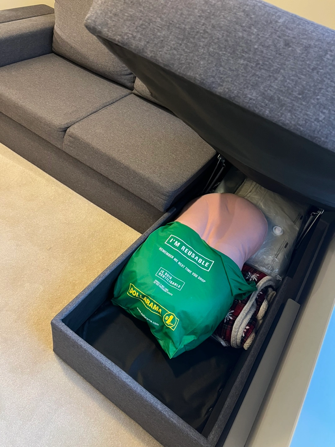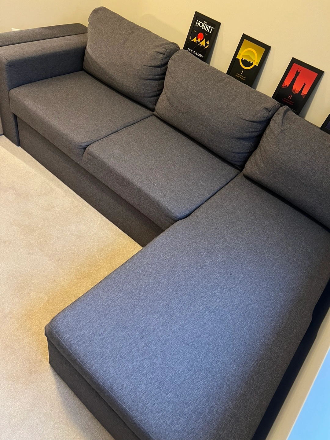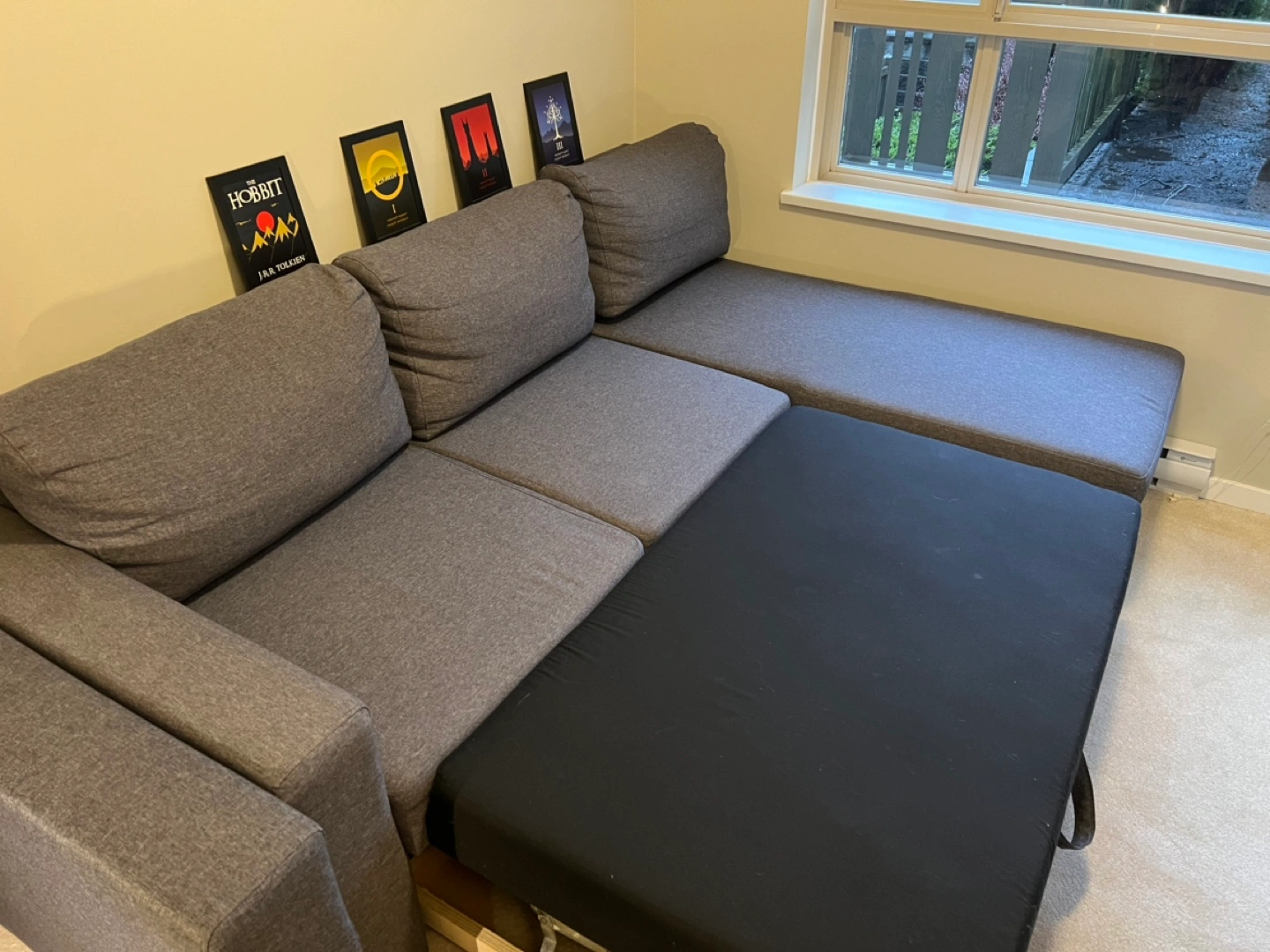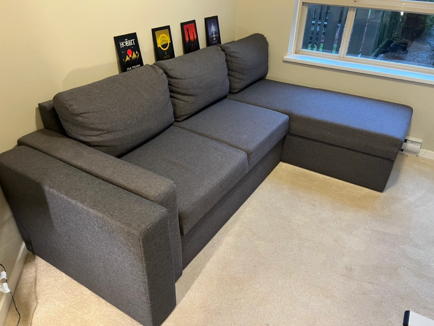 18Marslev Jysk Grey fabric corner sofa-bed. Includes storage space. Pull-out bed mechanism. Convertible chaise. One of the arms is detached as it doesn’t fit my space. Selling because I need a new one otherwise I’d keep it. Dimensions in the picture.