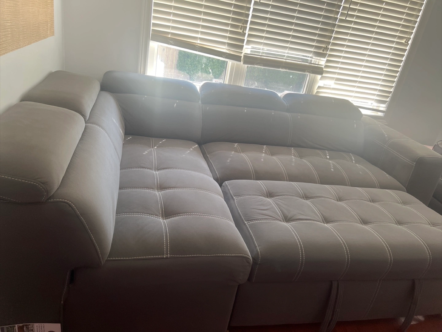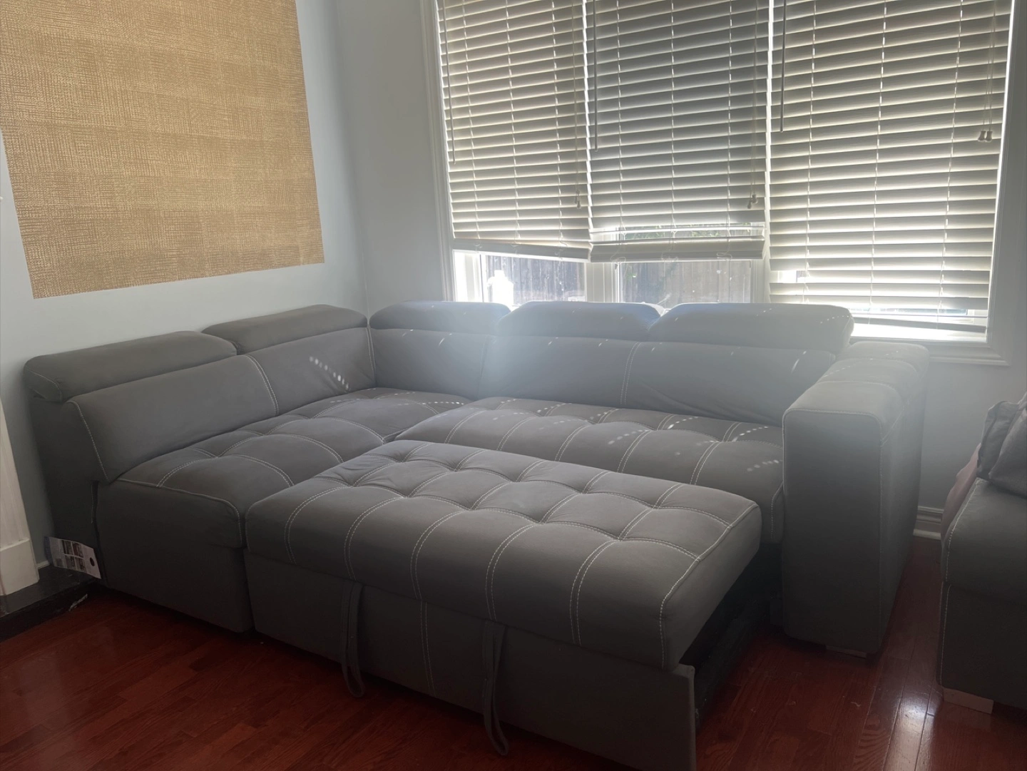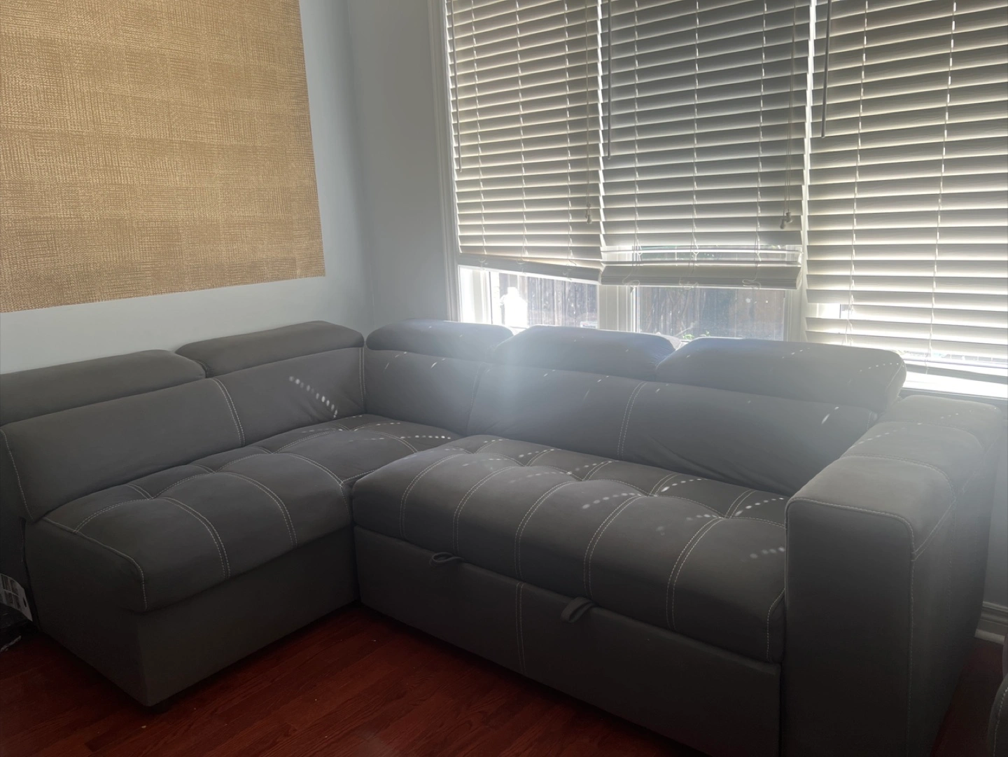 Spacious sectional sofa in a neutral gray color. Comes with an ottoman .Featuring detailed stitching. Perfect for relaxing after a long day. I always covered with sheet for making stainless. Sofa-cum-bed and ottoman have storage. -Good asset for living room -Extremely comfortable. -Ottoman have storage space -Every sitting space has head rest available. -Superior quality fabric used. -Purchased 2 years back for 2100$ Now selling it very low . Negotiations allowed. Moving shortly, should go asap Serious Buyers contact