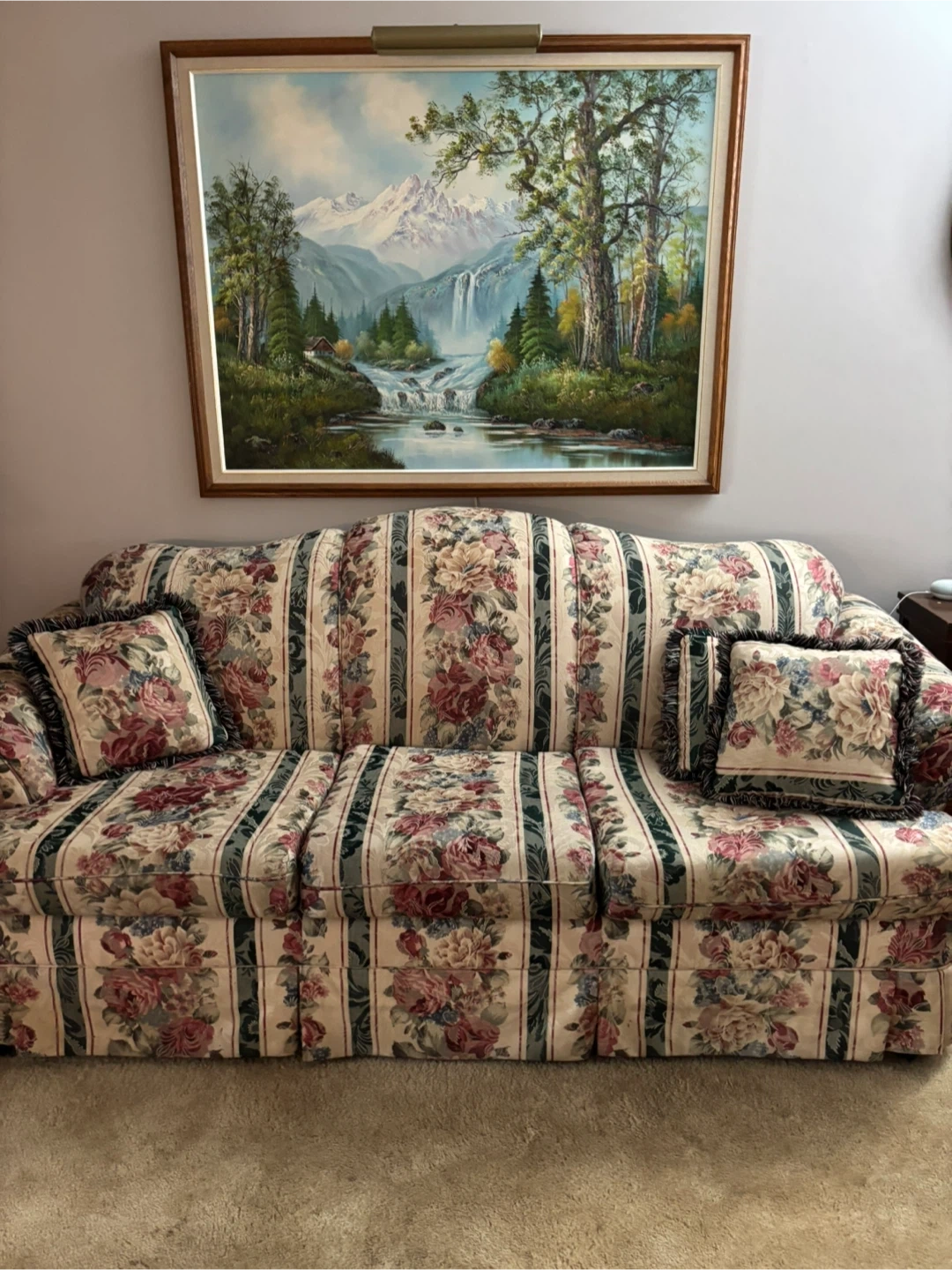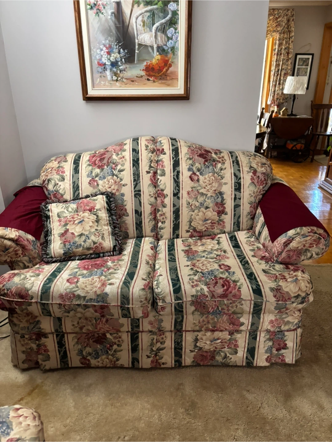 67Selling a comfy sofa, love seat and chair with a lovely floral pattern! It comes with matching pillows to complete the look. The two end tables will come with the furniture. The sofa is in good condition, smoke and pet free elderly home.