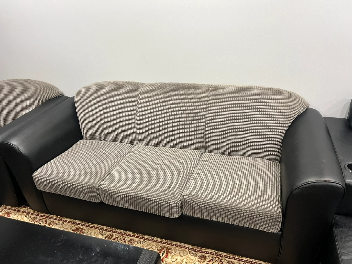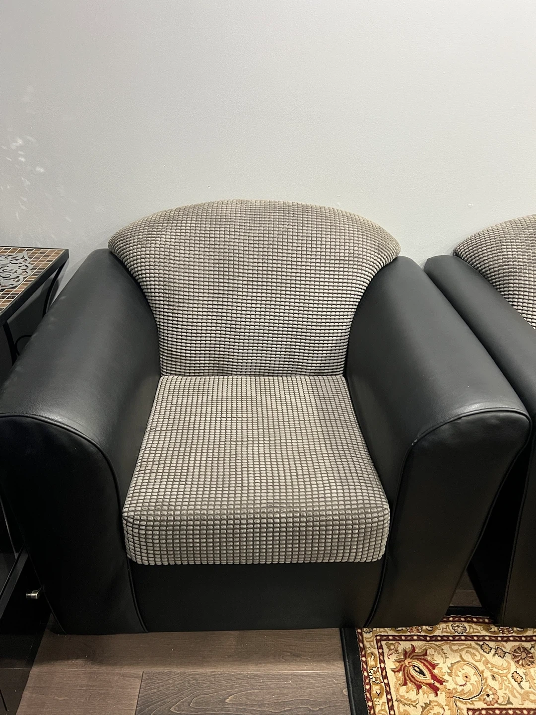 60Selling a sofa set that includes a loveseat and a 3-seater sofa. The sofas have a black faux leather frame with patterned grey cushions. They're in good condition and ready for a new home! Small damage on the leather from regular wear n tear.