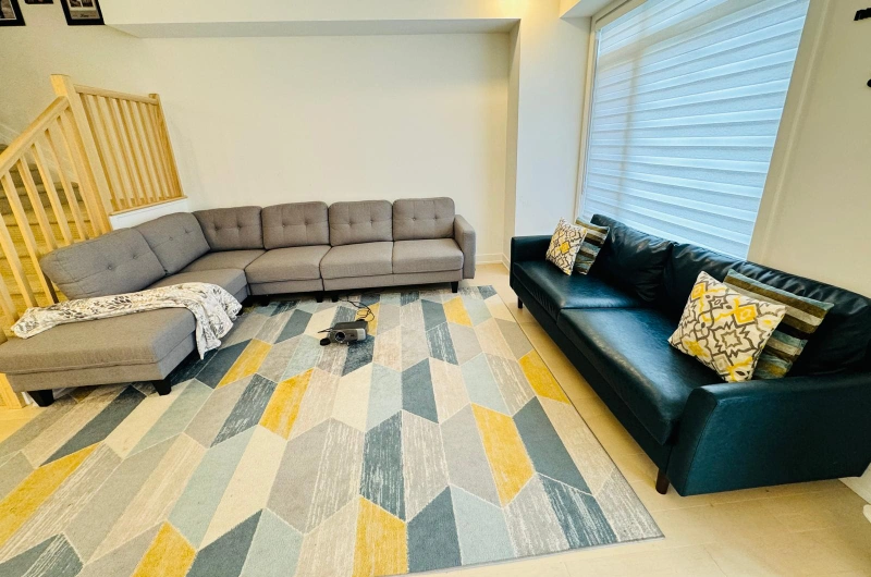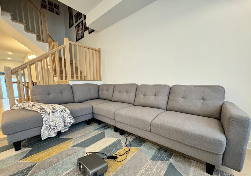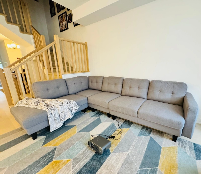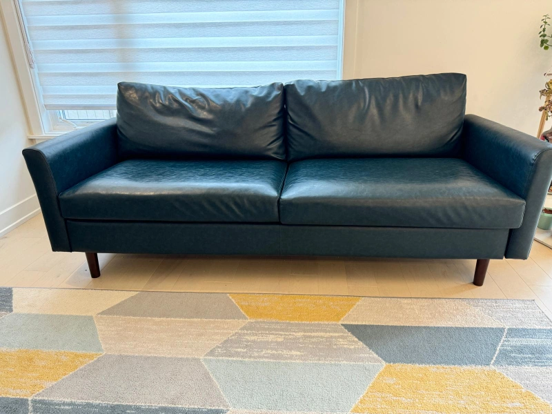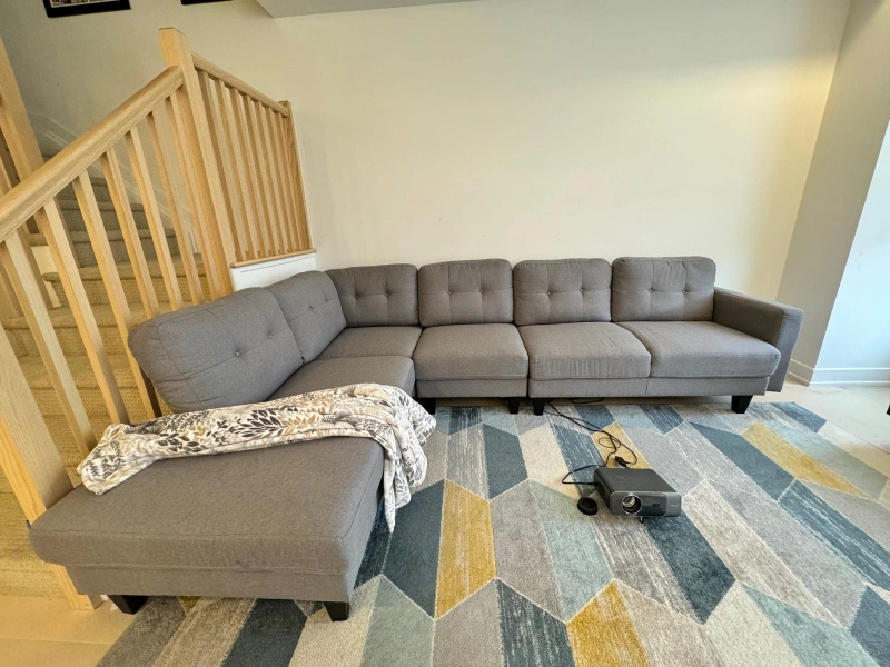 The sectional was bought in July 2023. It is a left facing sectional sofa with detachable units. 3 seater sofa and the carpet were bought in February 2023. The sofa is water resistant, made of faux leather with high density foam cushions. All are in mint condition, no wear and tear and from smoke and pet free. Originally bought at $1806 and $1500 respectively. (has original receipts) Asking $950 and $ 700 respectively if bought separately. And $1500 if bought together. sofa:w 80.3", h 33.4" & d 33.4". Carpet: 9.10 x 7.10 ".