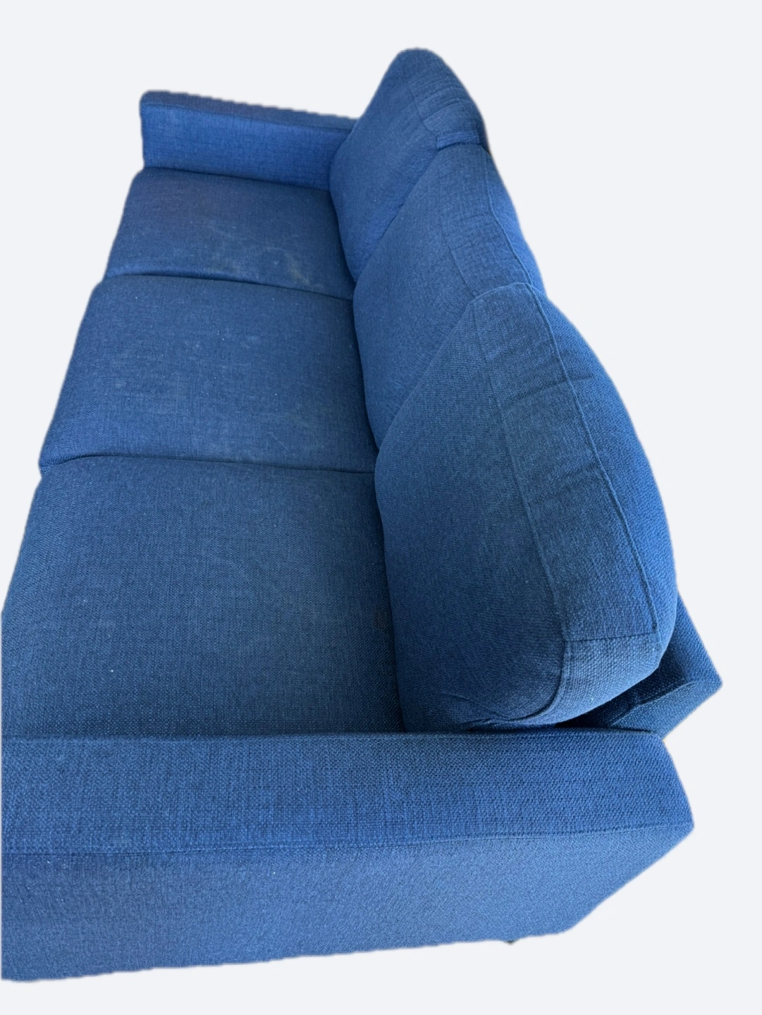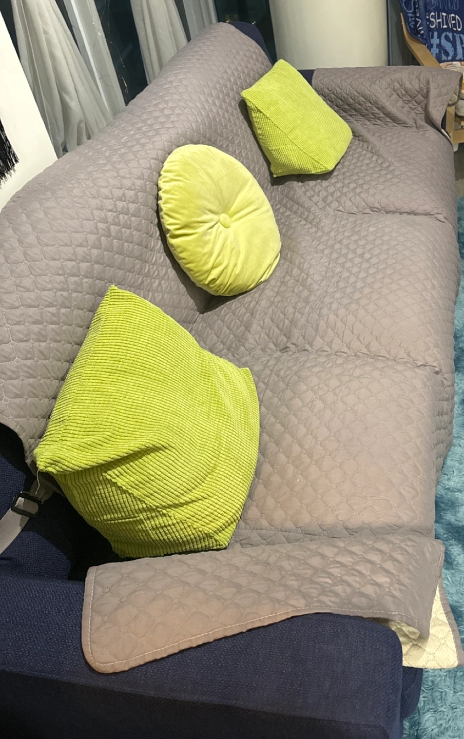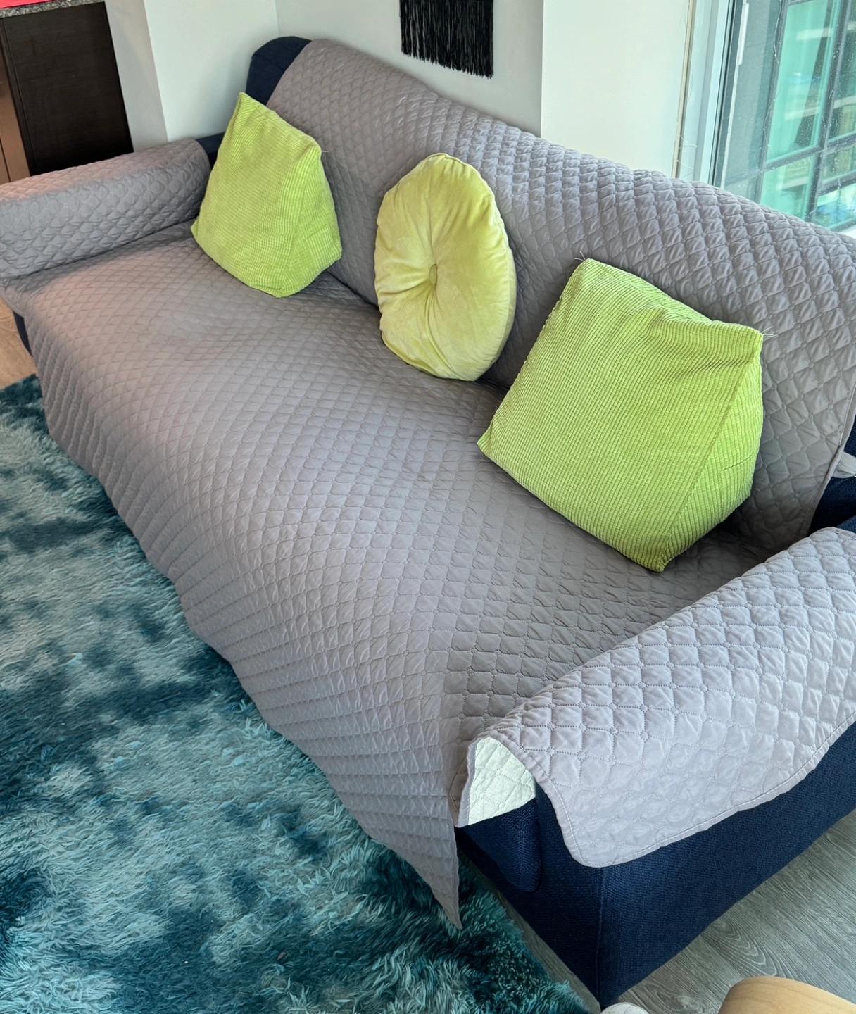 Blue comfy mini sofa perfect for living room with Grey quilted sofa cover. Three lime green corduroy cushions included. Protects furniture from spills and wear.