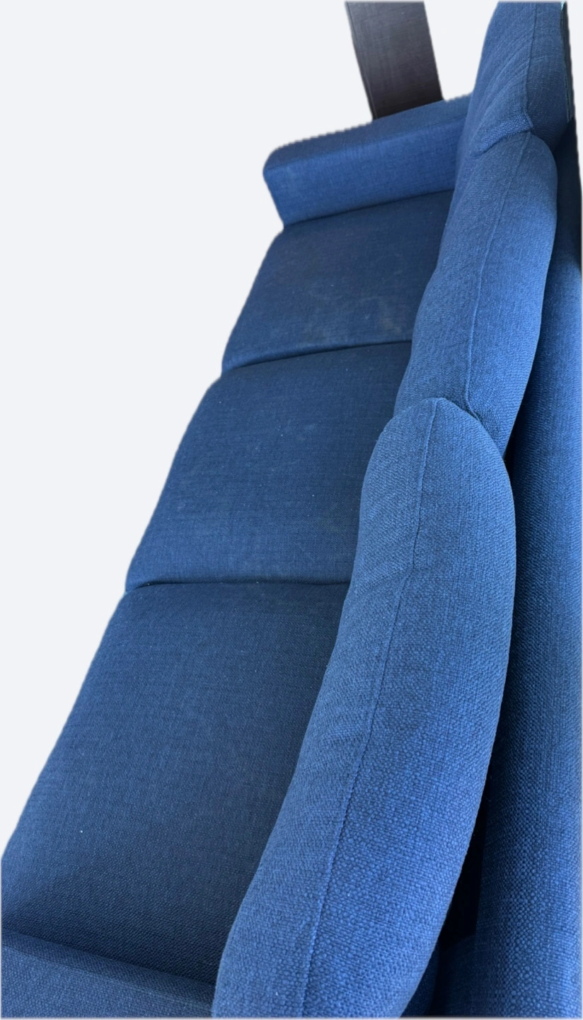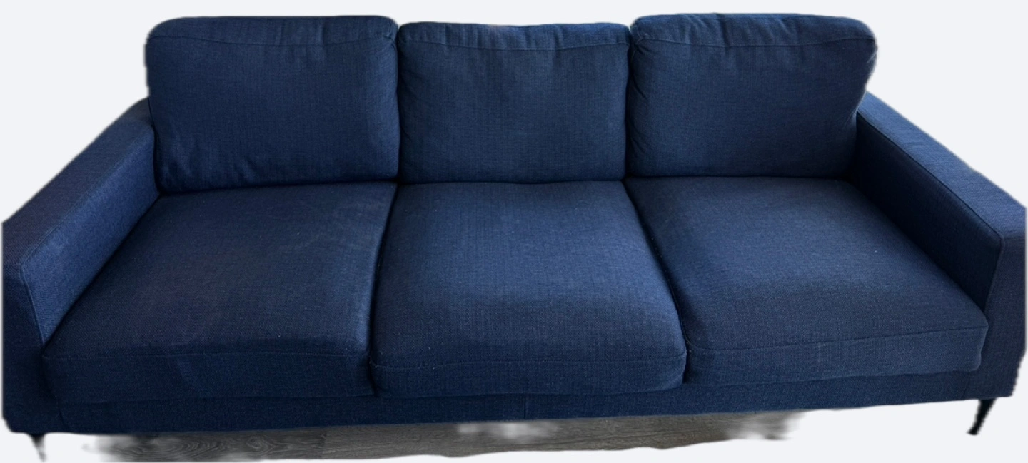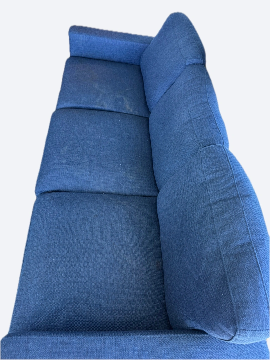 Blue comfy mini sofa perfect for living room with Grey quilted sofa cover. Three lime green corduroy cushions included. Protects furniture from spills and wear.