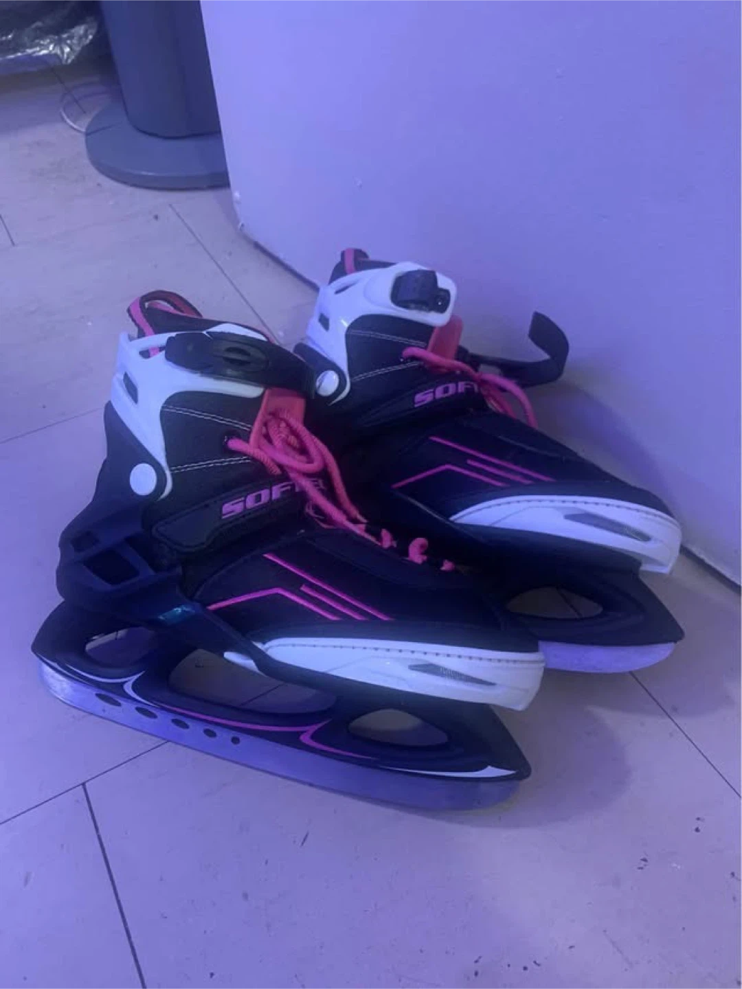 15Between the sizes women 6-9 Selling a pair of Sofia ice skates in black and pink. They are in good condition and ready for the rink! The skates have a stylish design with pink accents, perfect for adding a pop of colour to your skating gear