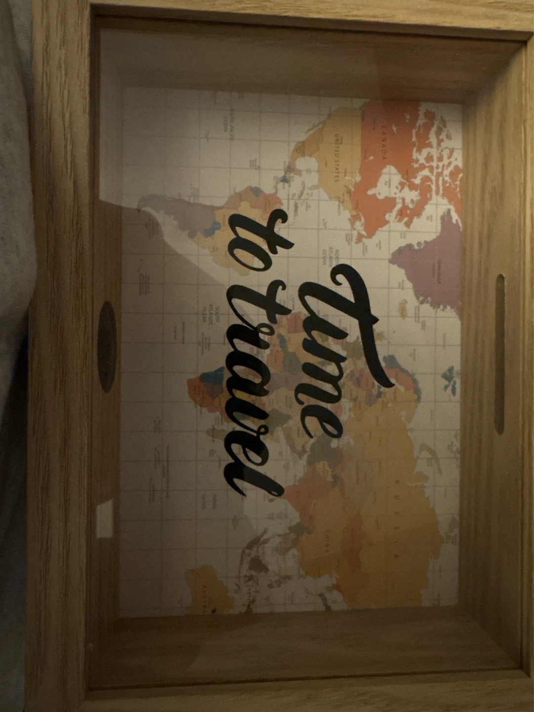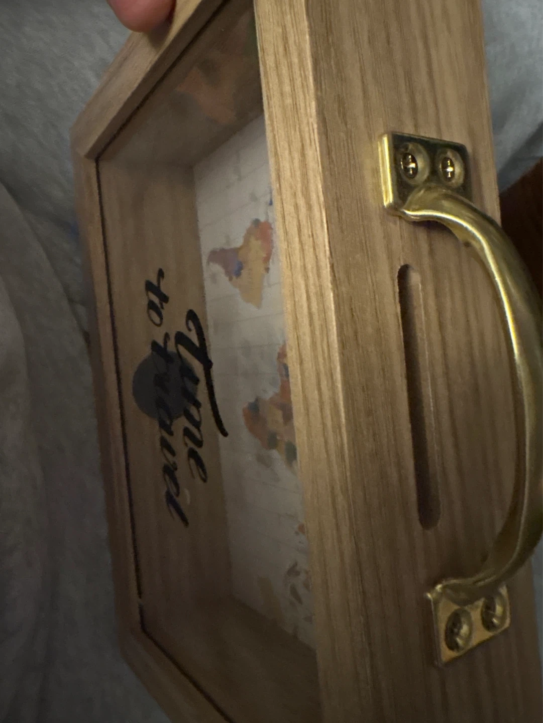 Wooden piggy bank with a "Time to Travel" world map design. Features a brass handle for portability. Includes a coin slot on top. Great for saving up for your next adventure!