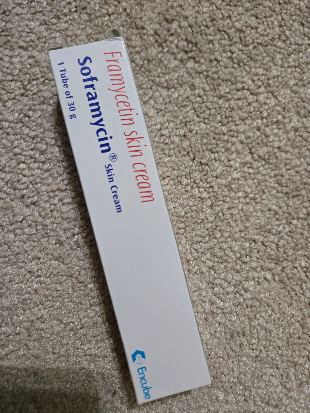 Tube of Soframycin skin cream. 30 grams. Treats burns, scalds, wounds, cuts, ulcers, boils, impetigo, furunculosis, sycosis barbae, otitis externa, paronychia and secondary infections in scabies and lice. Expiry date 42/2026. For external use only. Brand new tube, never used, never opened.